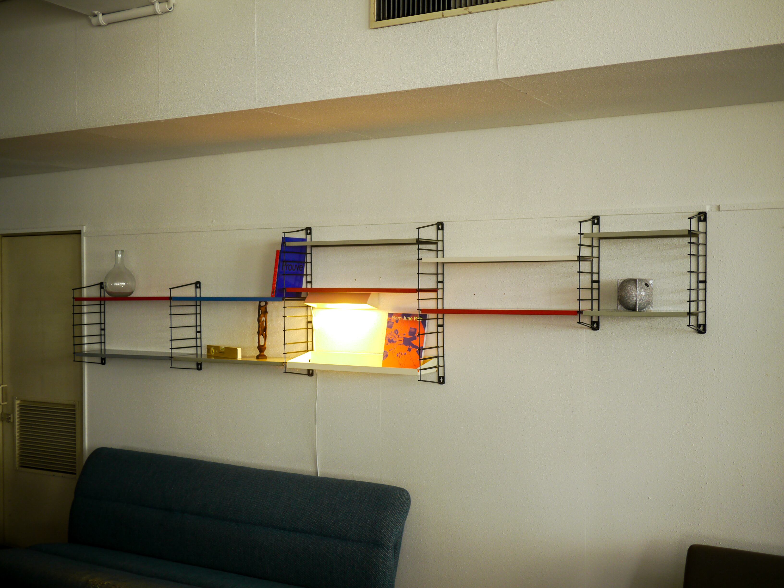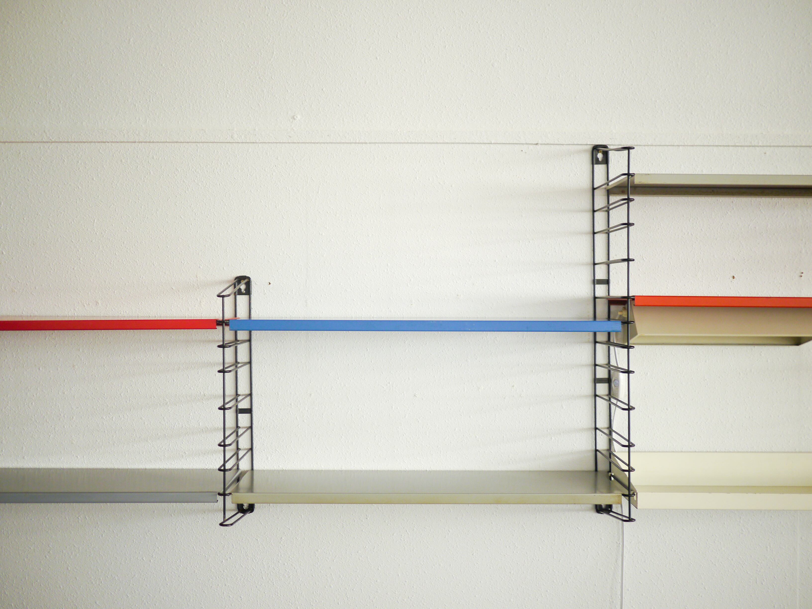 数あるカラーバリエーションが特徴的なこのアイテムは、モジュール式にパーツや色を組み合わせることでウォールシェルフからデスクシステムまで幅広い拡張性があり、ユーザによってオリジナリティあるレイアウトを楽しむことができました。
