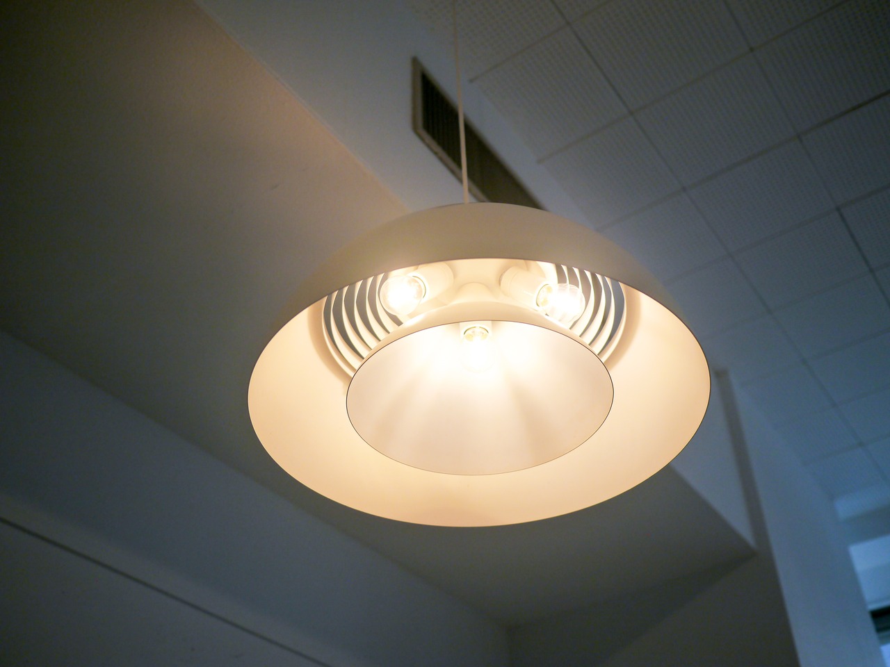 テーブルを照らす1灯の他に、上部に配置された3灯の光がスリットを抜けて漏れ、天井との間の空間を柔らかく演出しラウンジの雰囲気に。こちらはホワイトですが、経年によってマットな質感のオフホワイト寄りになってます。経年変化による色味をお楽しみください。