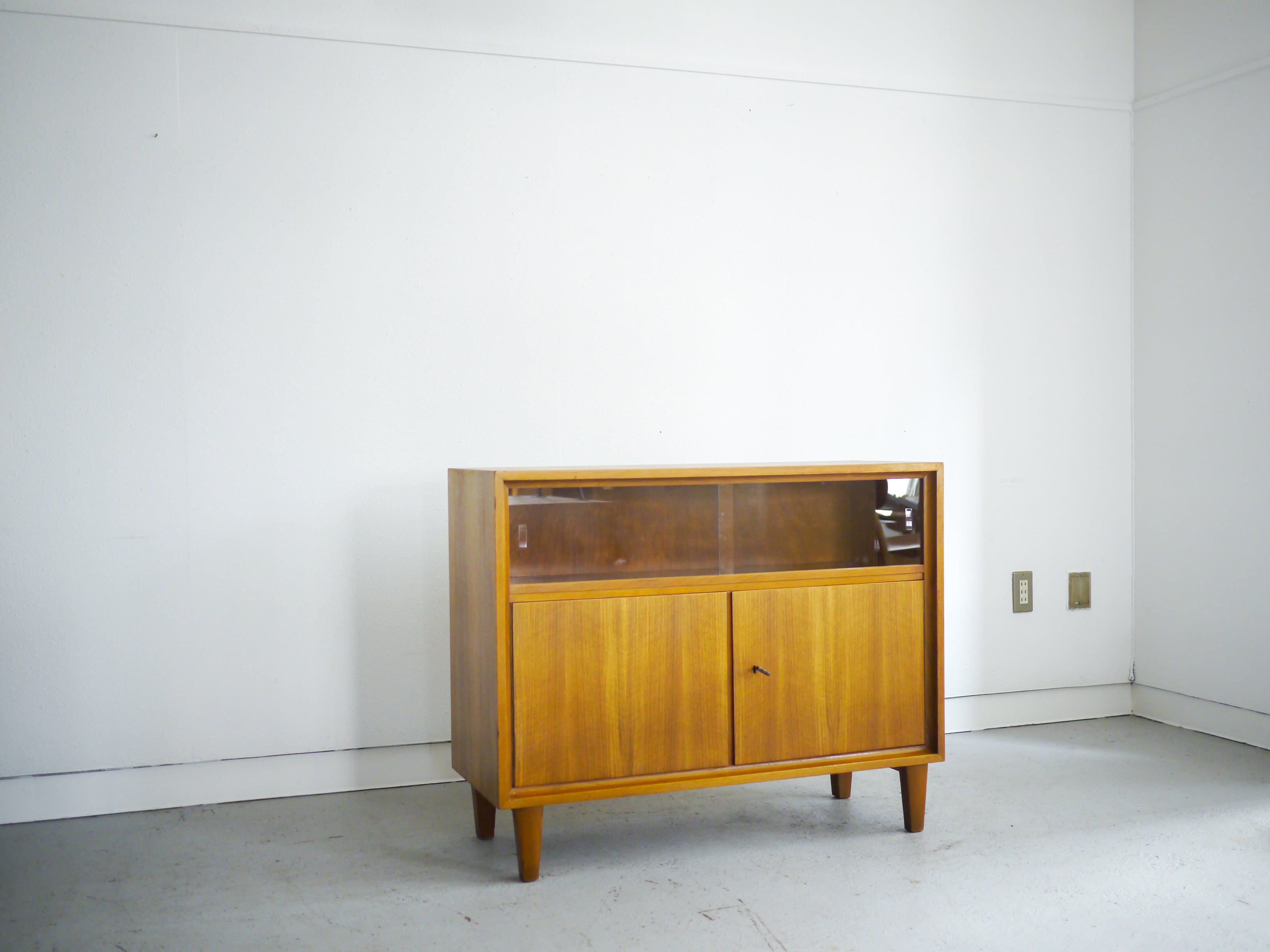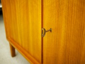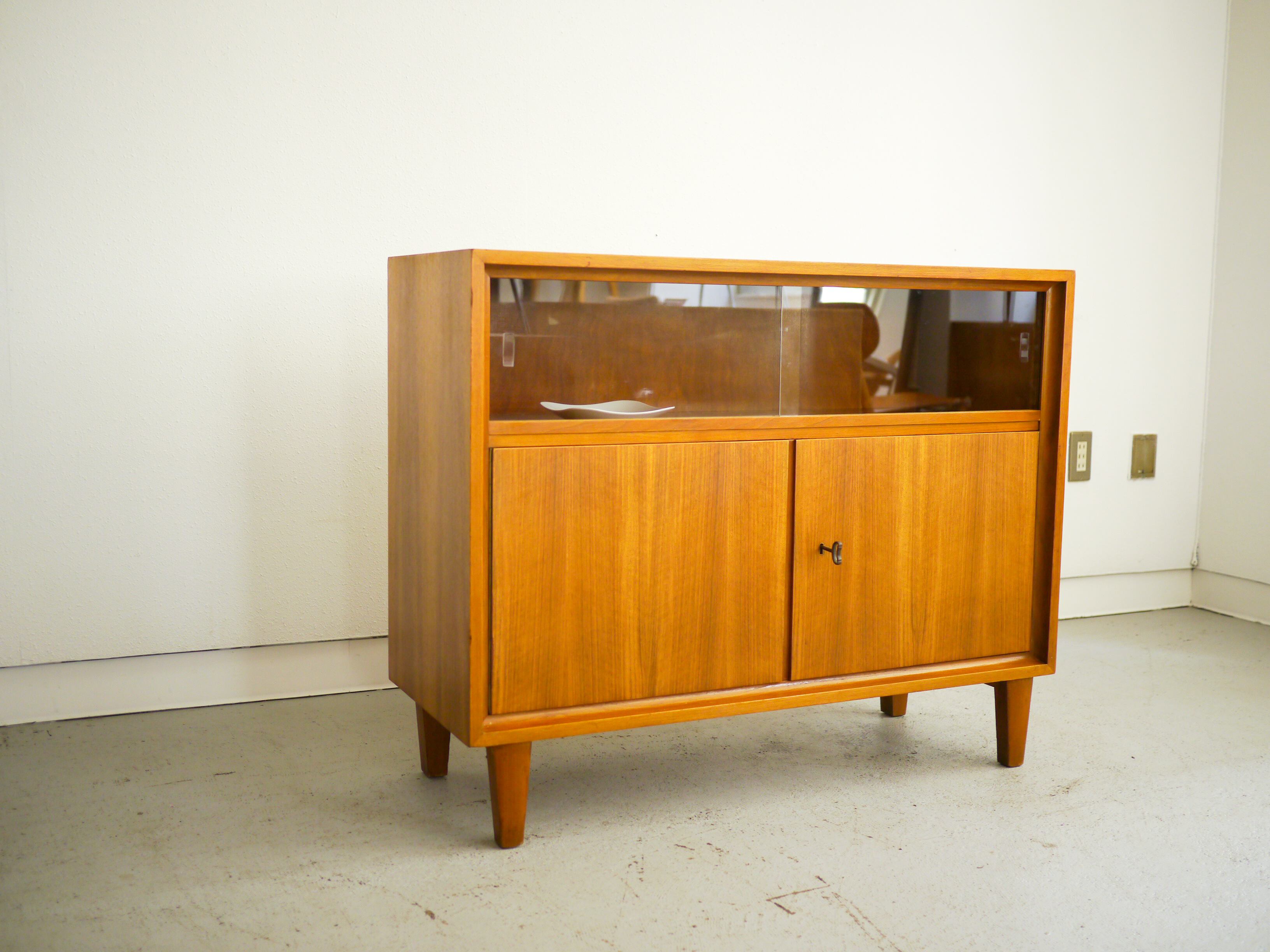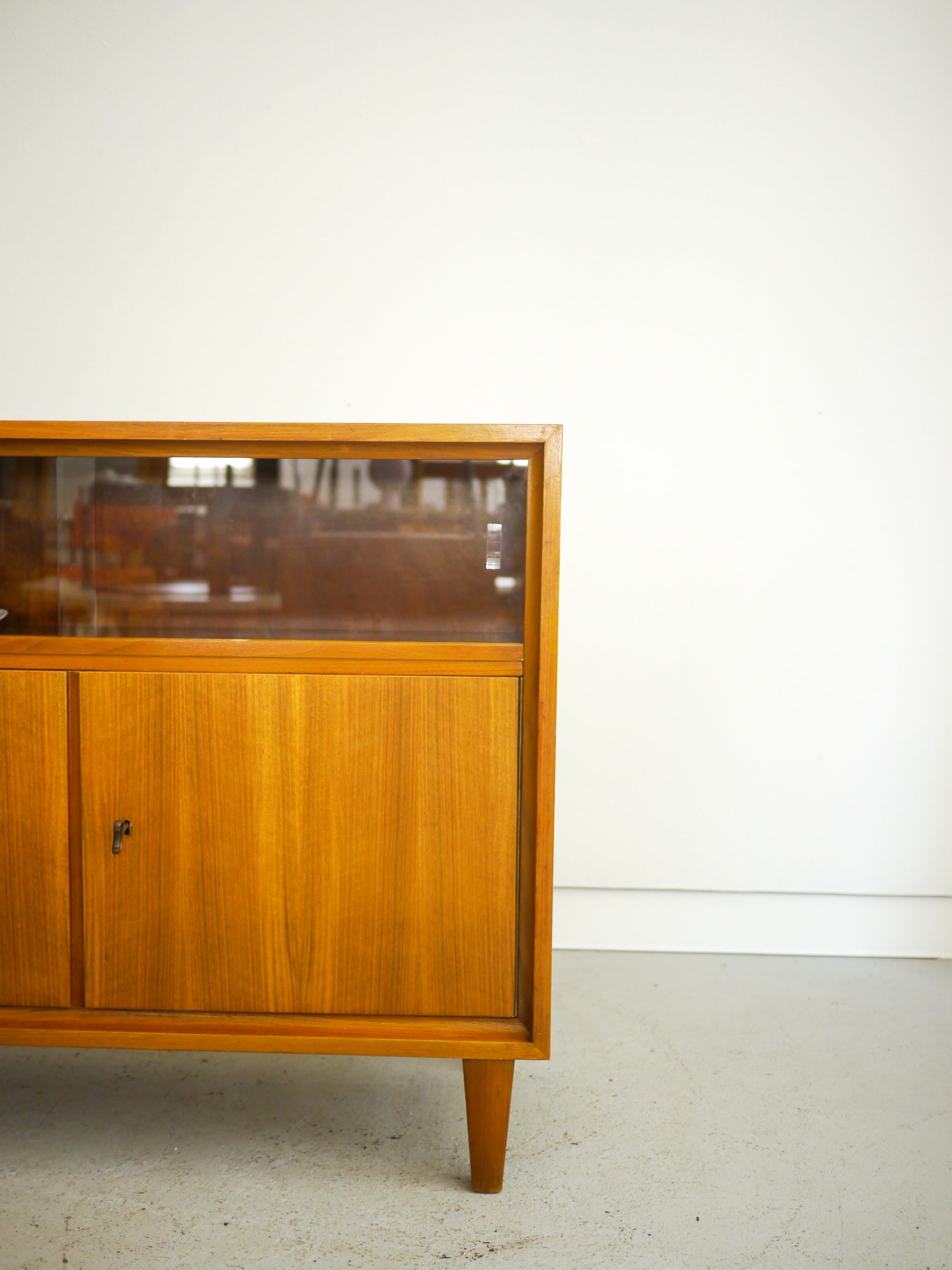 上段はスライドガラス、下段は観音開きの扉で構成されており用途に合わせて収納場所をお選びいただけます。チーク材の赤みが程よく、北欧らしくもありながら付属の鍵や縁取りなどがシンプル過ぎない一癖。上段に食器などを入れキッチンなどで使っていただくのも良いかもしれません。
