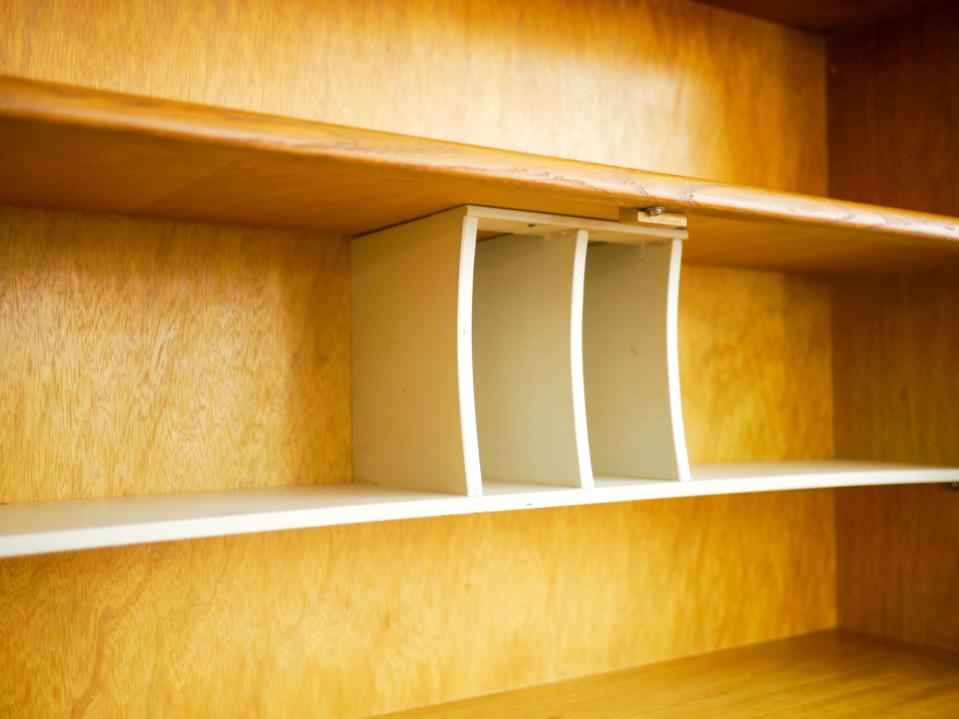 中段の扉を開けると簡単なデスクとなり、使い勝手も十分。下段の棚板も取り外し・高さ調節が可能です。
