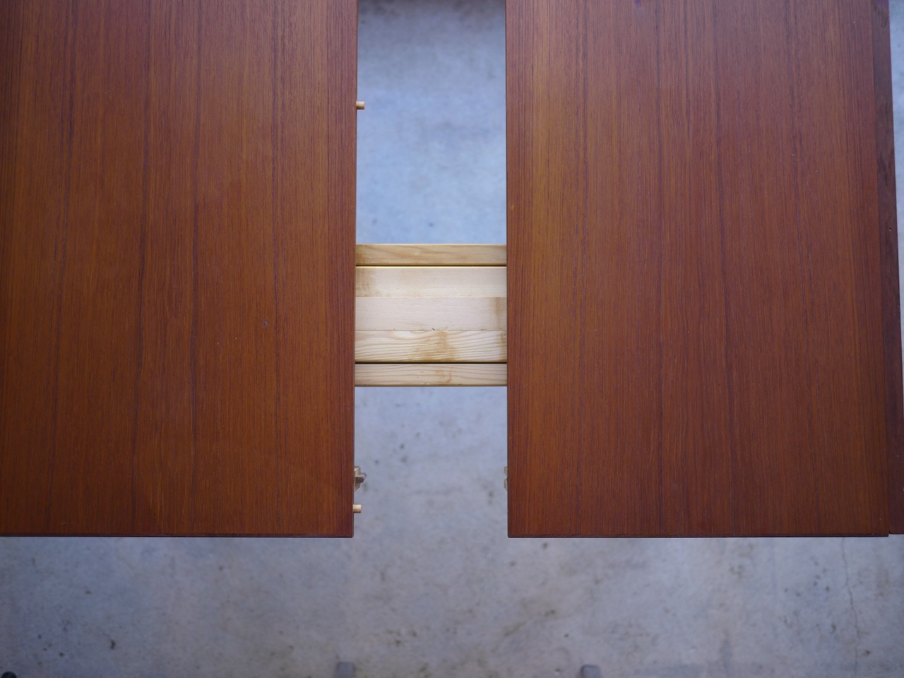 用途に応じて、片方、両方と跳ね上げることが可能です。また、本体は真ん中で割れる構造になっており、そこに別のエクステンションを差し込むことも可能。テーブルの幅は最小735mmから最大2080mmと大変身を遂げます。