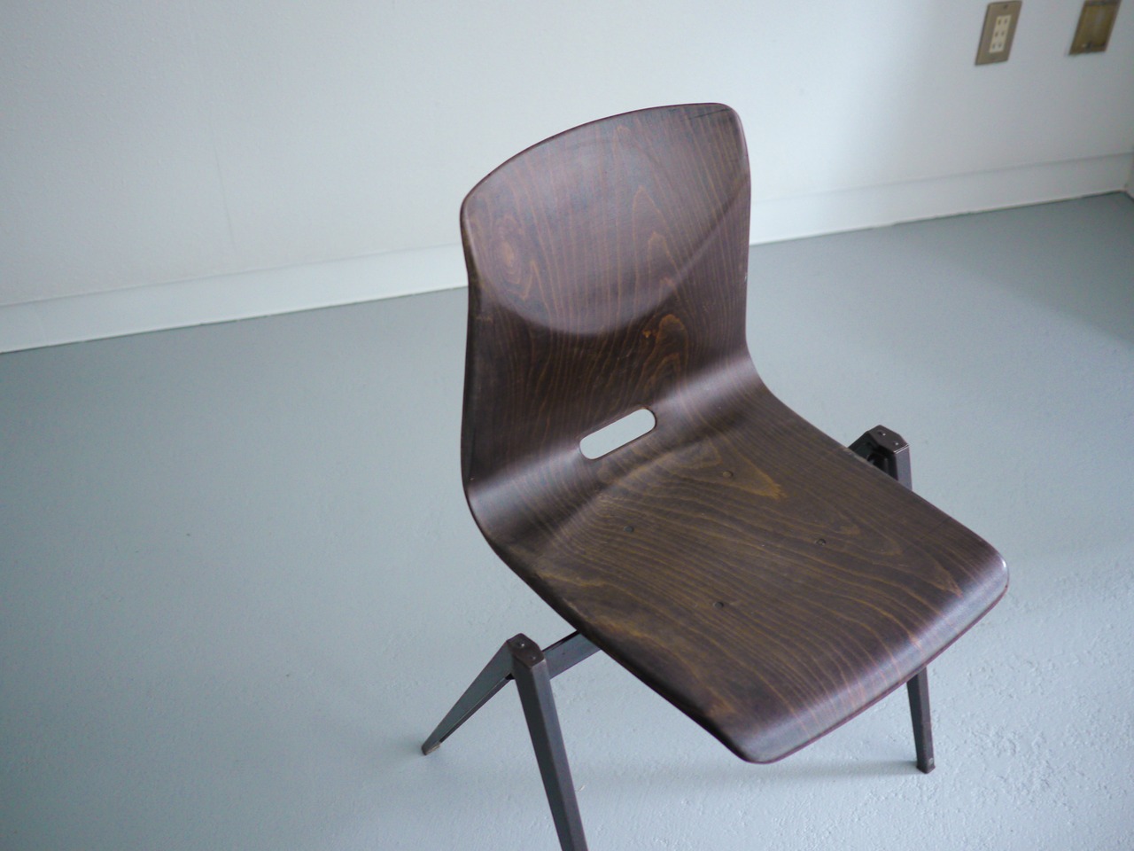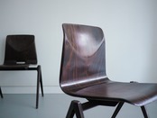 オランダ・ガルファニタス社と西ドイツPagholz(パグホルツ)社の共作によるスタッキングチェア。座面はパグホルツ社が開発した製法による、ブナ材と特殊樹脂を高圧圧縮して成型したプライウッド。座面の湾曲と、背のしなりがソリッドな見た目とは裏腹な座り心地を提供してくれます。スタッキングや横方向に連結してベンチの様に使用することも可能ですので、店舗などの使用にも向いています。