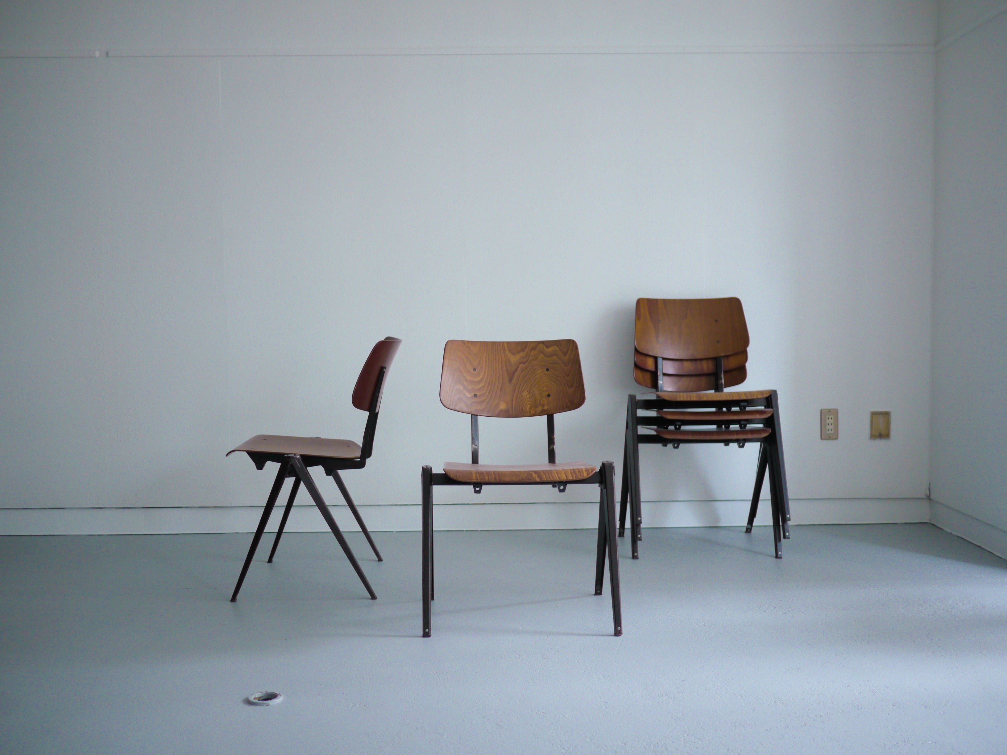オランダ・ガルファニタス社のコンパスレッグチェア。足幅がワイドでスタッキング可能なS21モデルです。アイコニックなダッチデザインのコンパスシェイプでありながら、スタッキング・横方向への連結も可能なチェア。現行品も販売されていますが、こちらはオランダにて買い付けましたヴィンテージ品となっております。