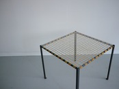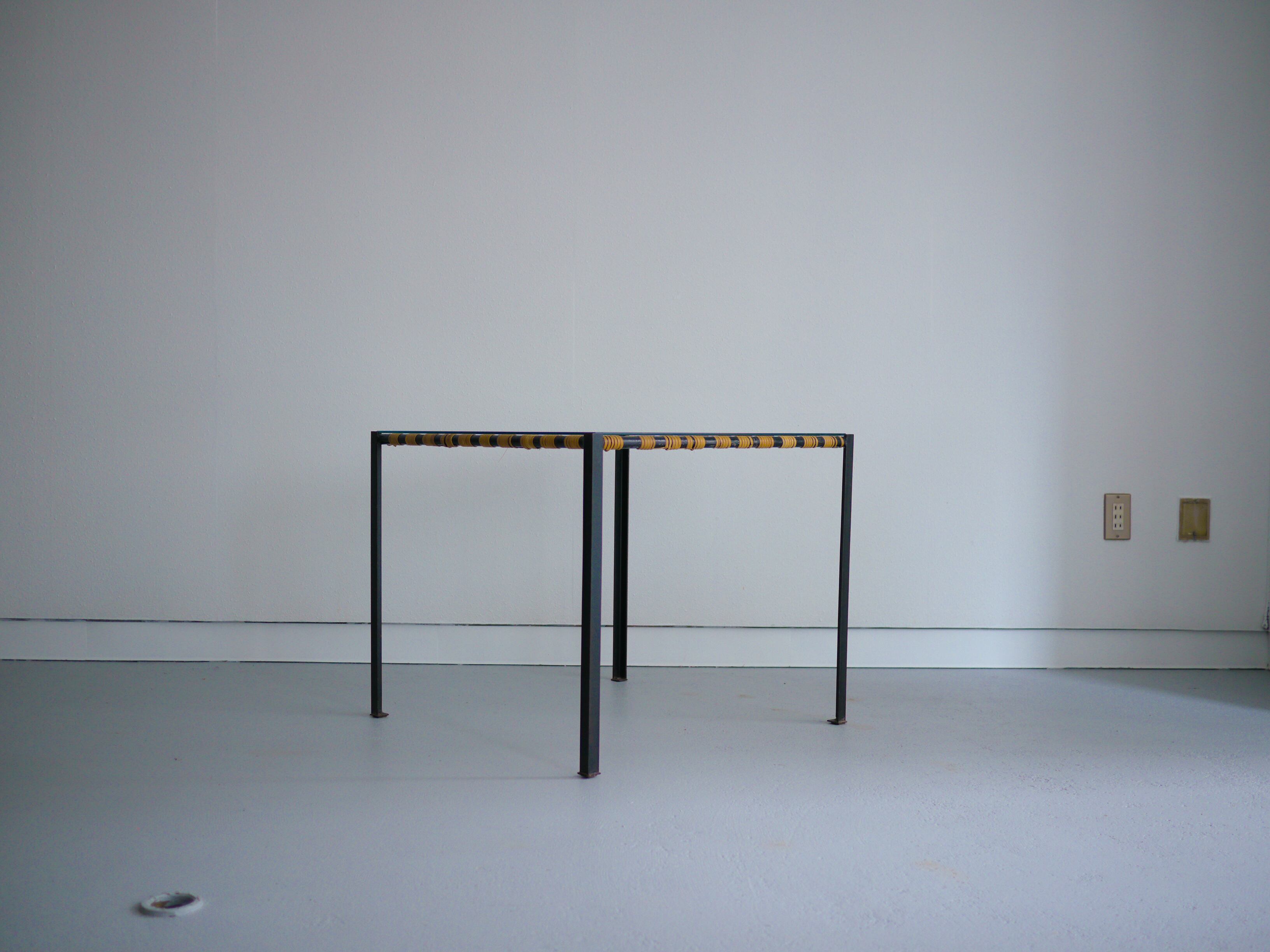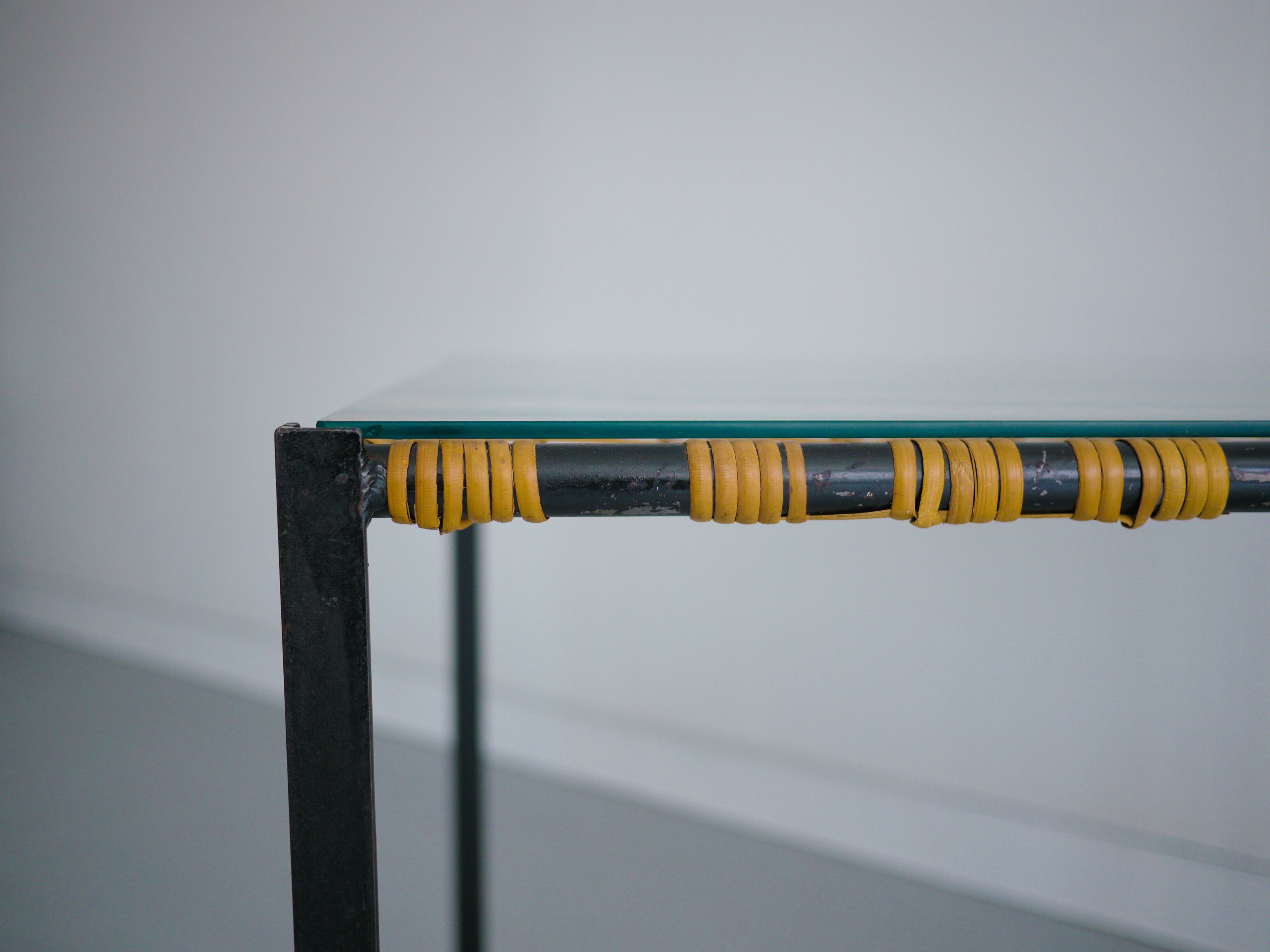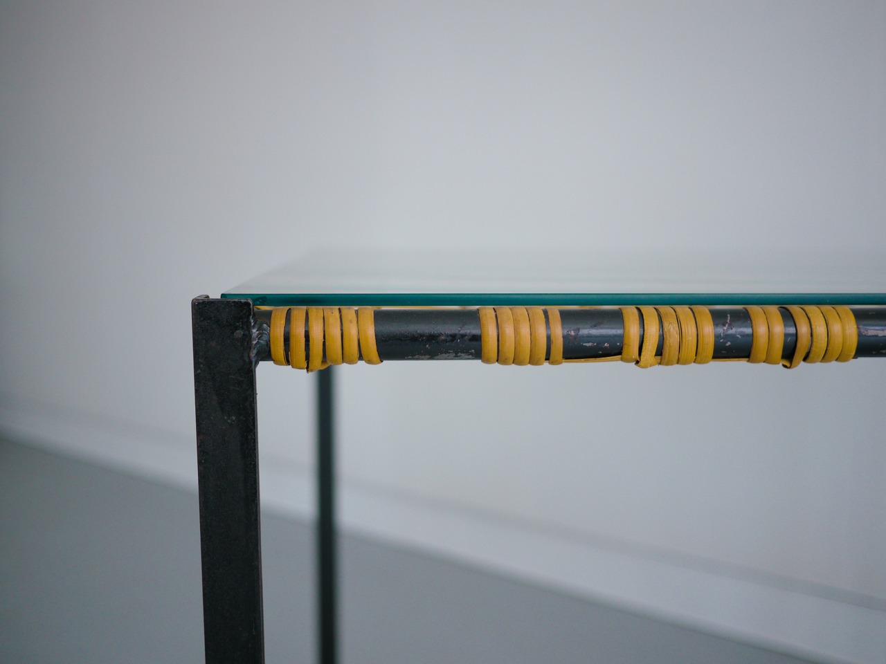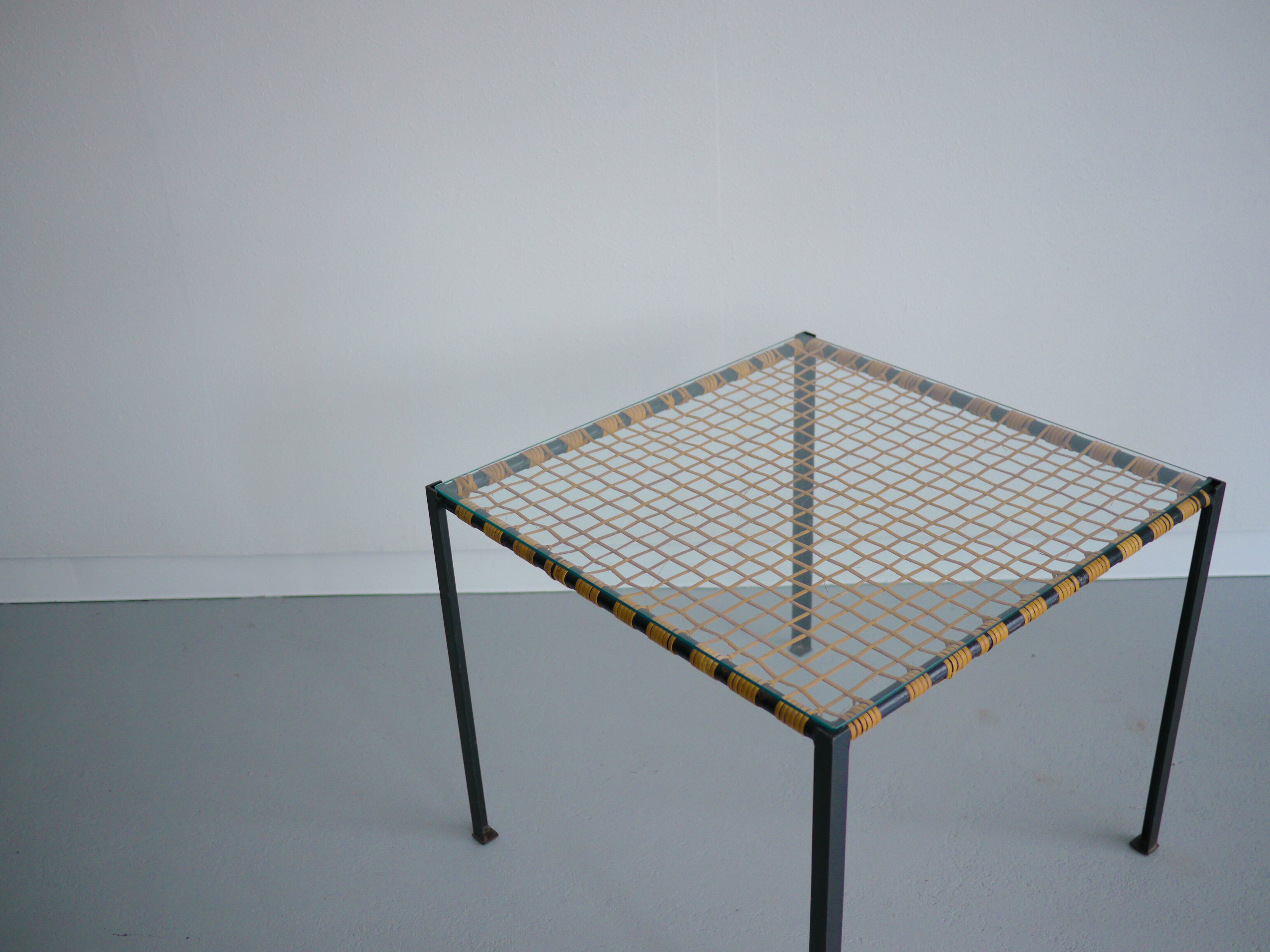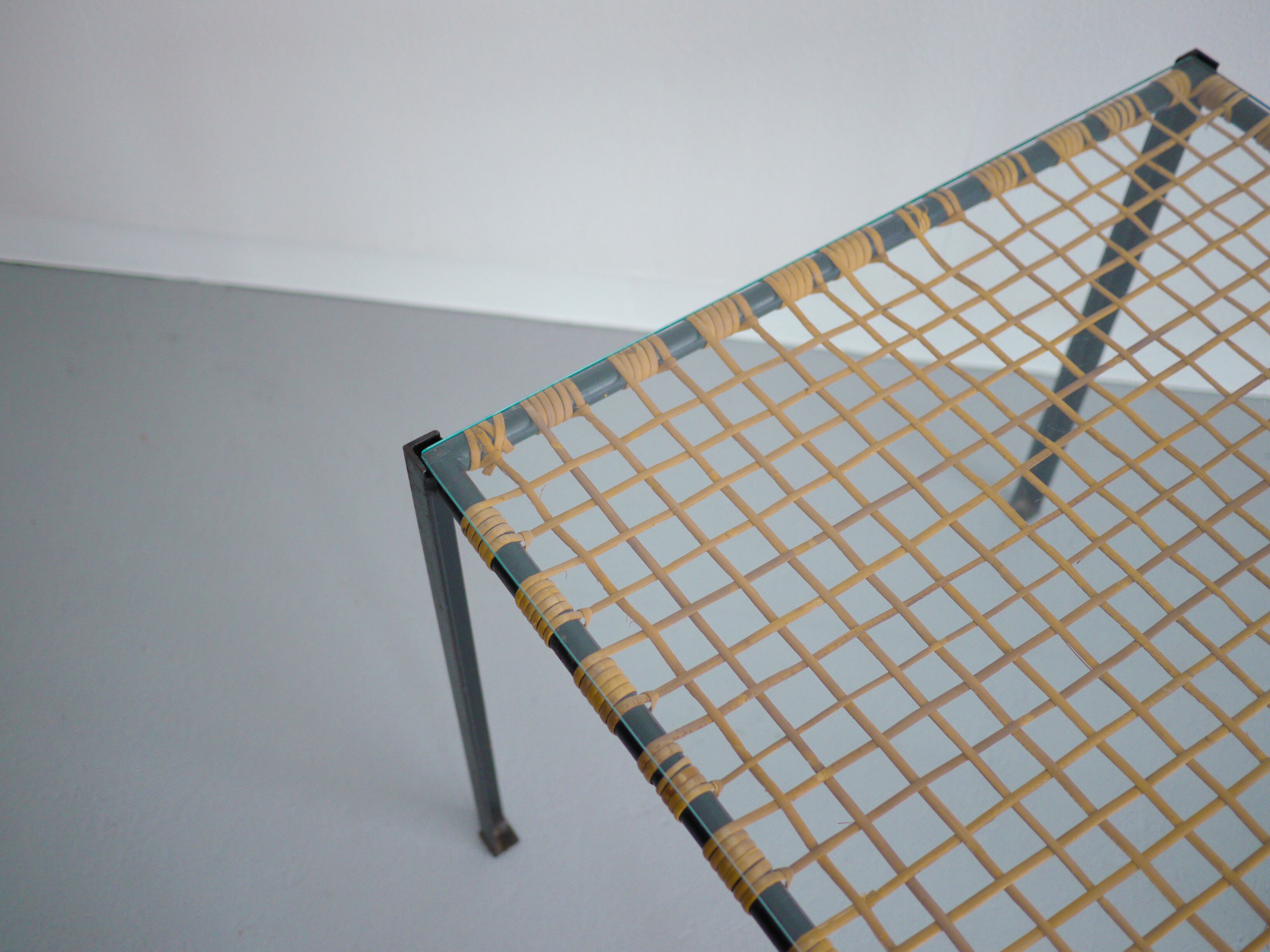 オランダにて買い付けましたガラストップのコーヒーテーブルです。しっかりとしたソリッドなアイアンフレームに、柔らかい印象のラタンの装飾が施され素材のコントラストが面白いアイテム。