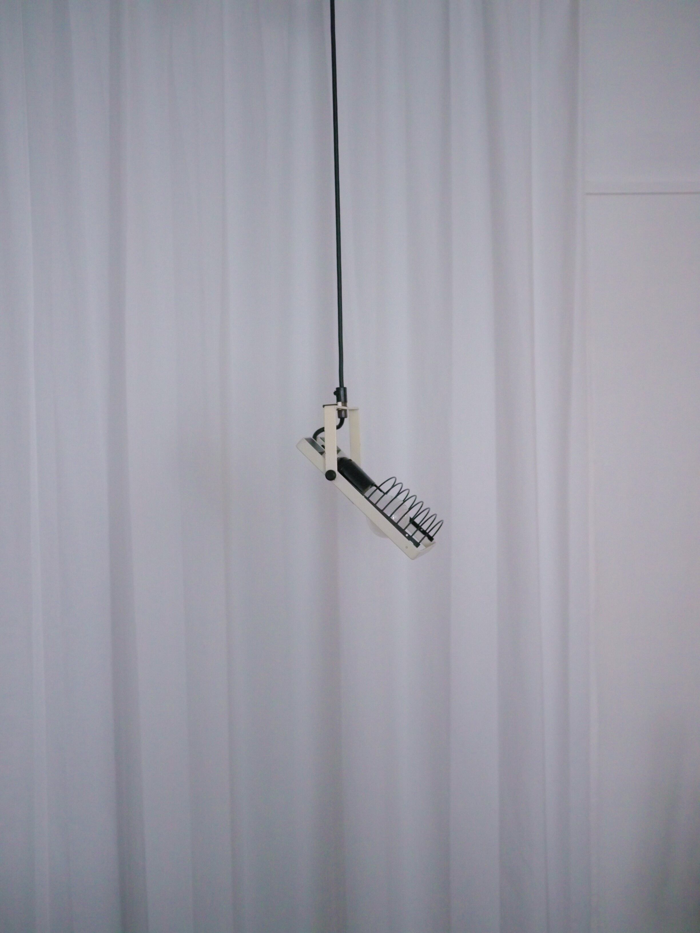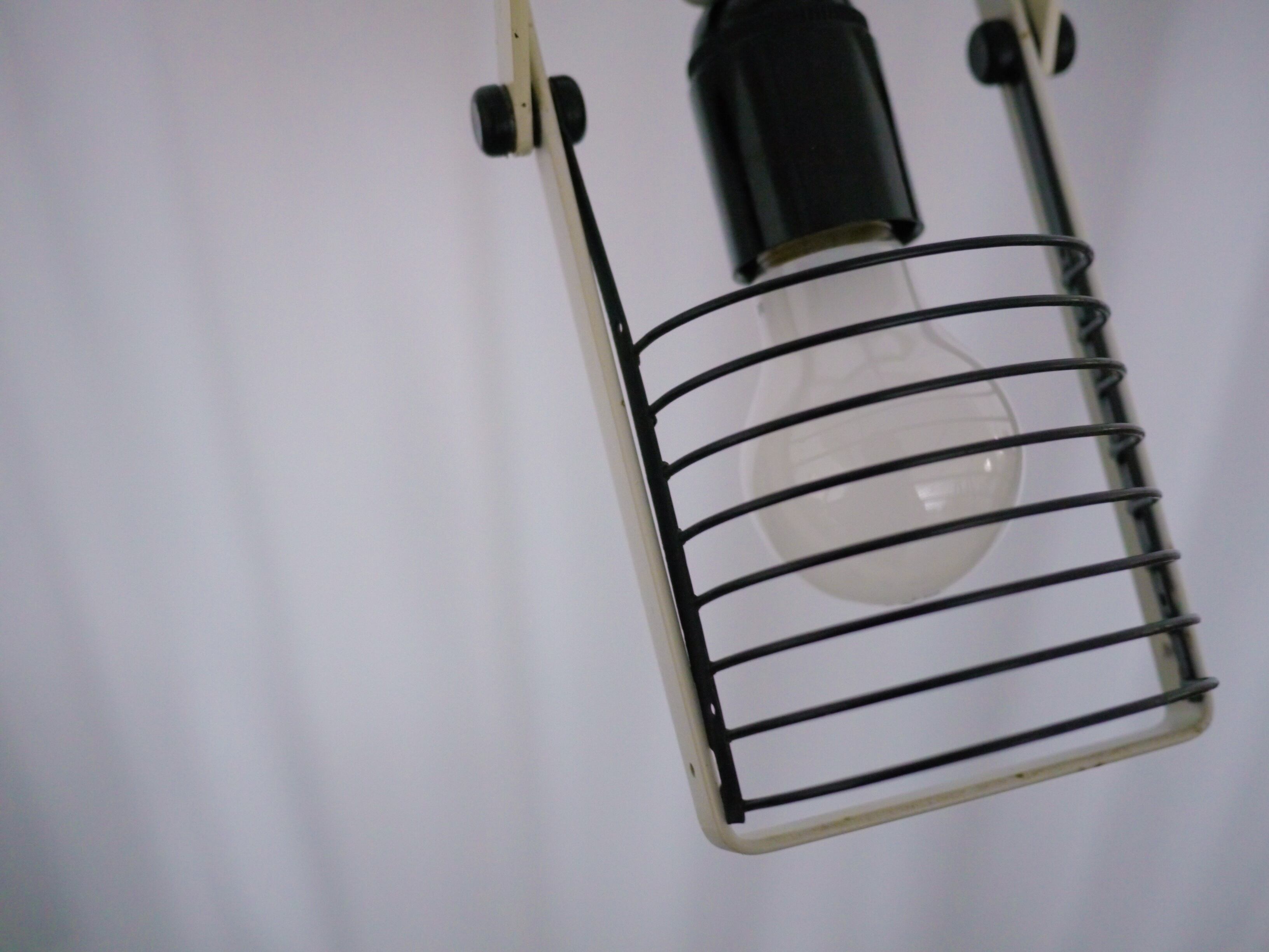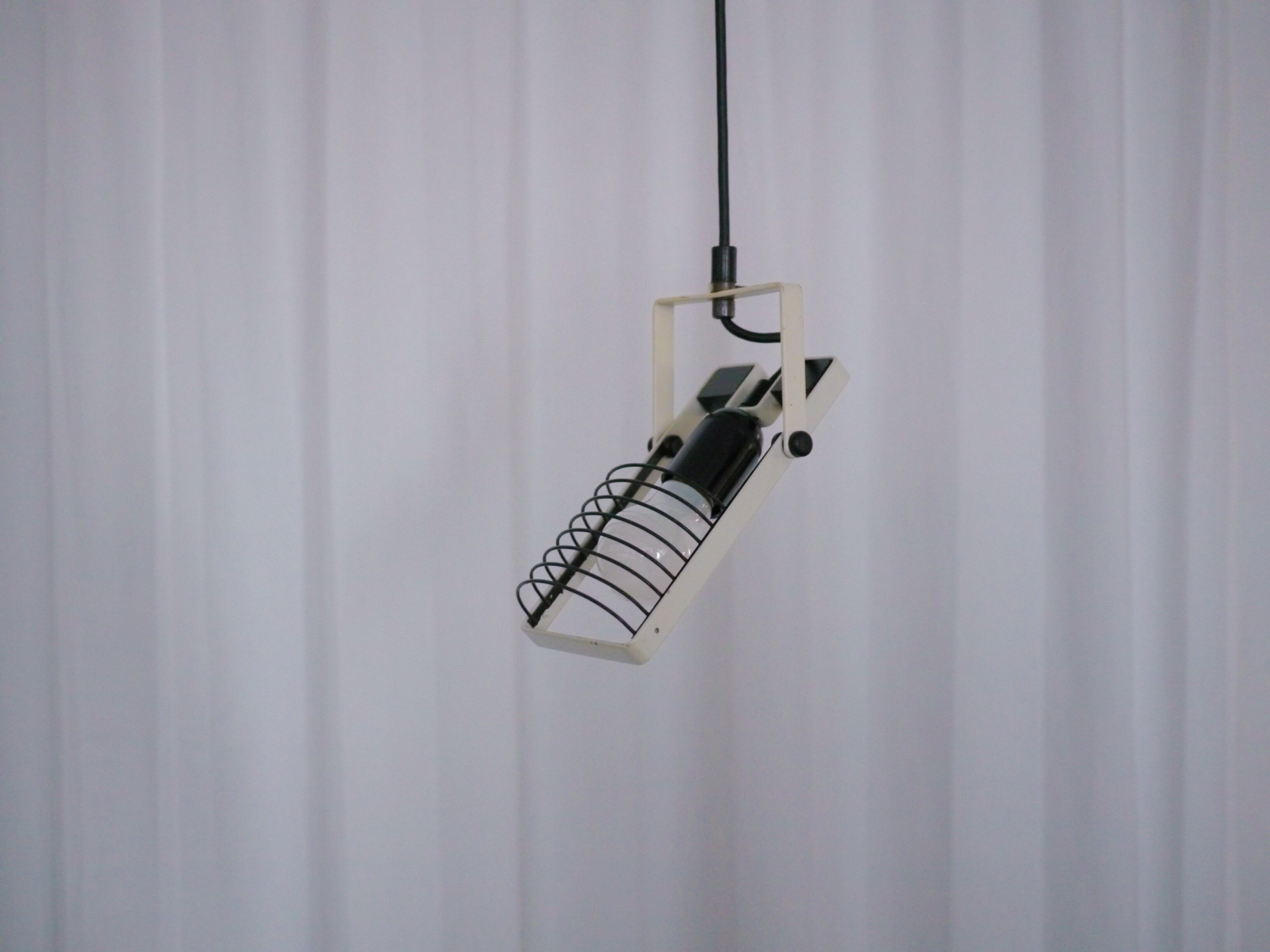 ルーバーにポストモダンライクな印象がありながらも、スタイリッシュなまとまりを見せるこのシリーズ。ルーバー部や本体の角度などは個別に調整できるので、好みのフォームを決められます。経年による擦れやサビ跡などがありますがオリジナルのホワイトのペイントもしっかりと残っており、比較的良い良いコンディションです。全体的にクリーニングを施し配線等は新品に交換、電源は引っ掛けシーリングより取っていただけます。また、オリジナルのシーリングカバー兼ステーも付属しますので天井への直付けでもご使用頂けます。