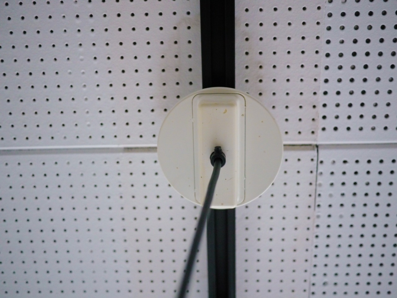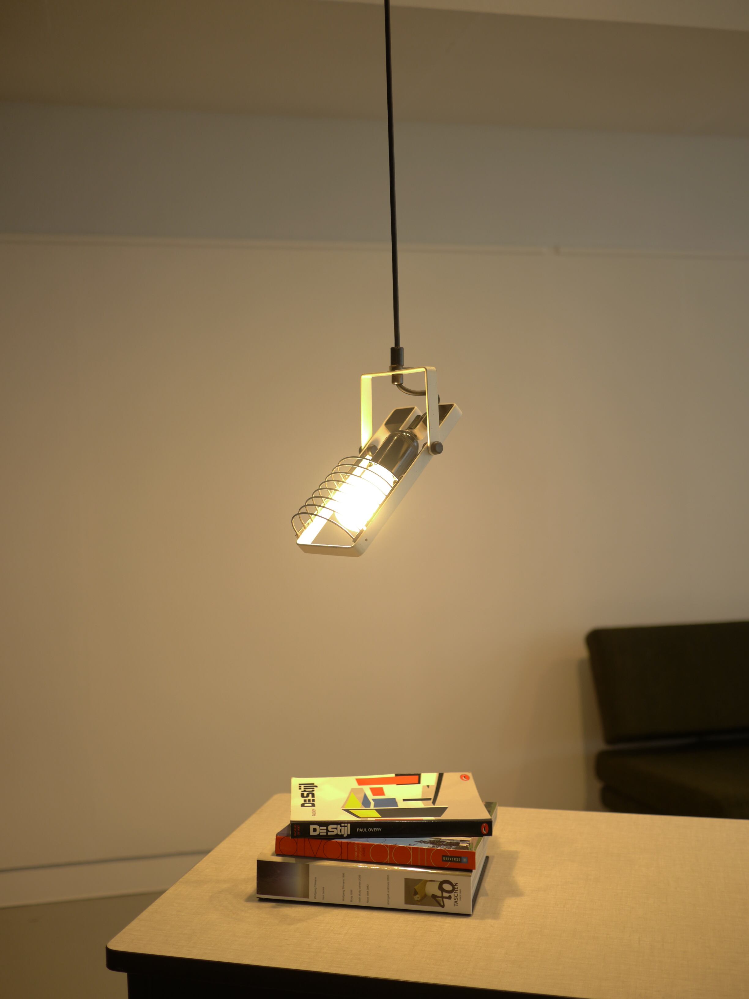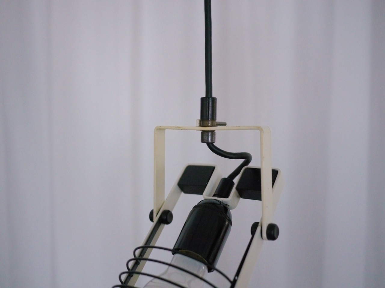 ルーバーにポストモダンライクな印象がありながらも、スタイリッシュなまとまりを見せるこのシリーズ。ルーバー部や本体の角度などは個別に調整できるので、好みのフォームを決められます。経年による擦れやサビ跡などがありますがオリジナルのホワイトのペイントもしっかりと残っており、比較的良い良いコンディションです。全体的にクリーニングを施し配線等は新品に交換、電源は引っ掛けシーリングより取っていただけます。また、オリジナルのシーリングカバー兼ステーも付属しますので天井への直付けでもご使用頂けます。