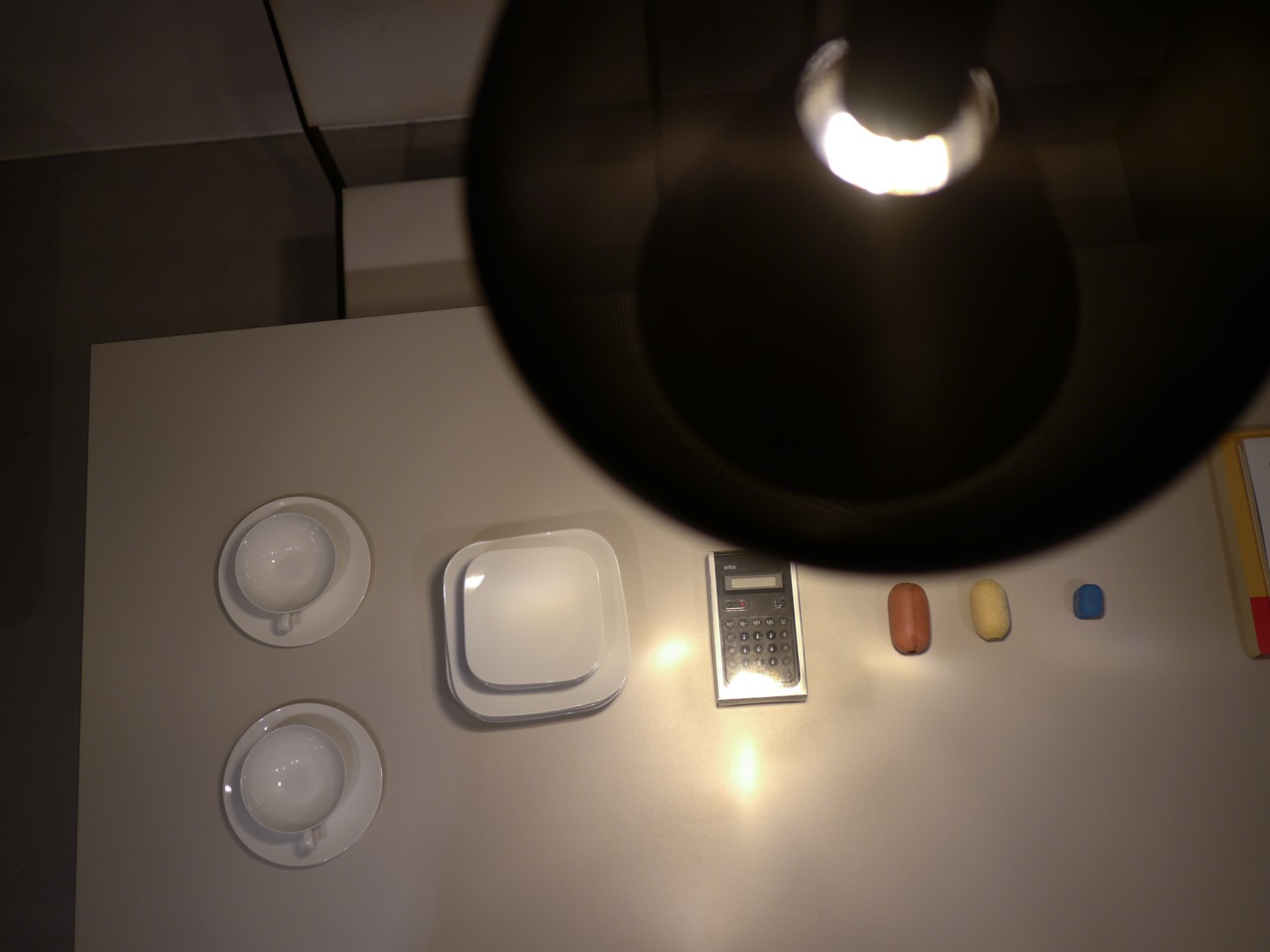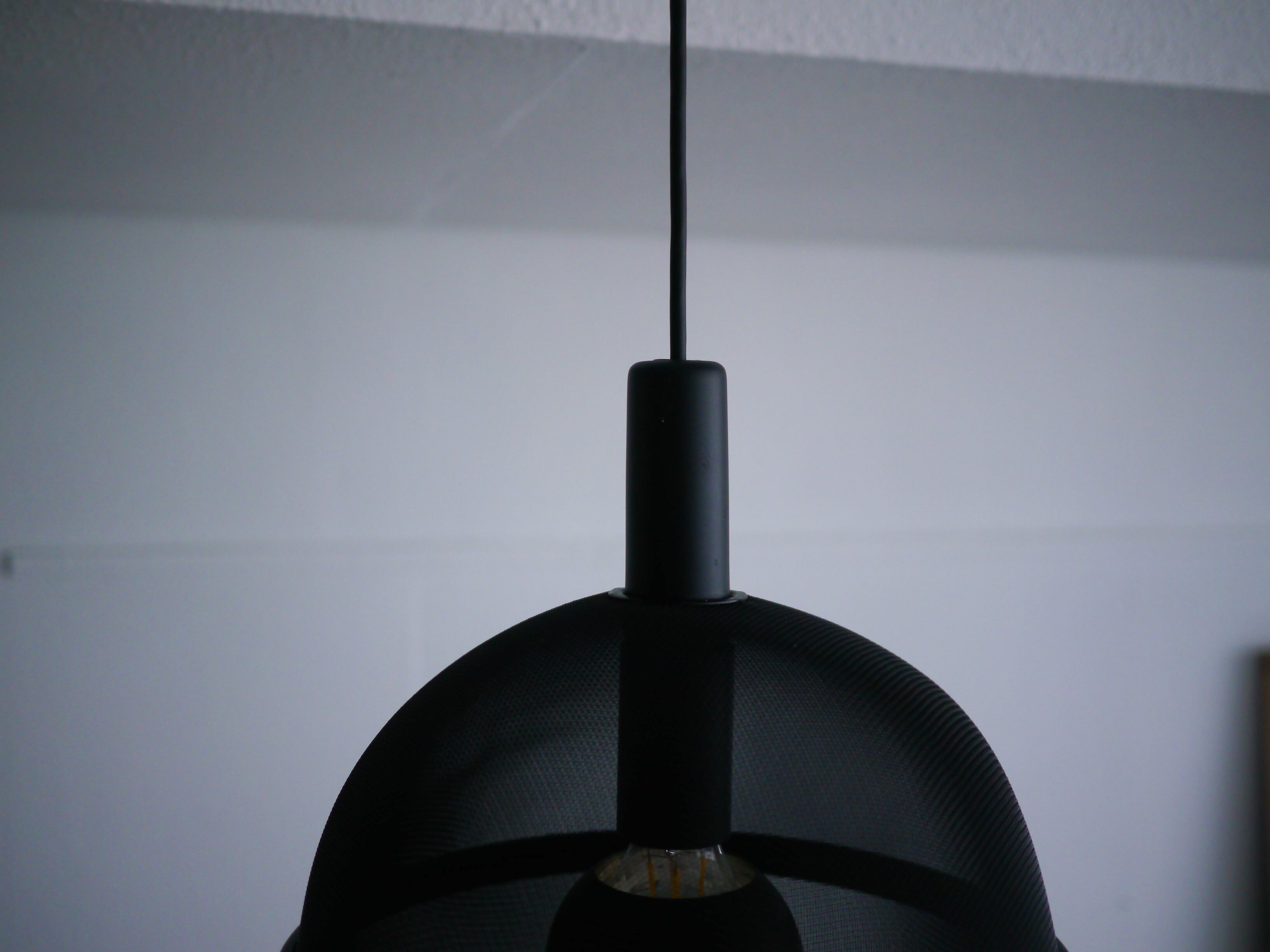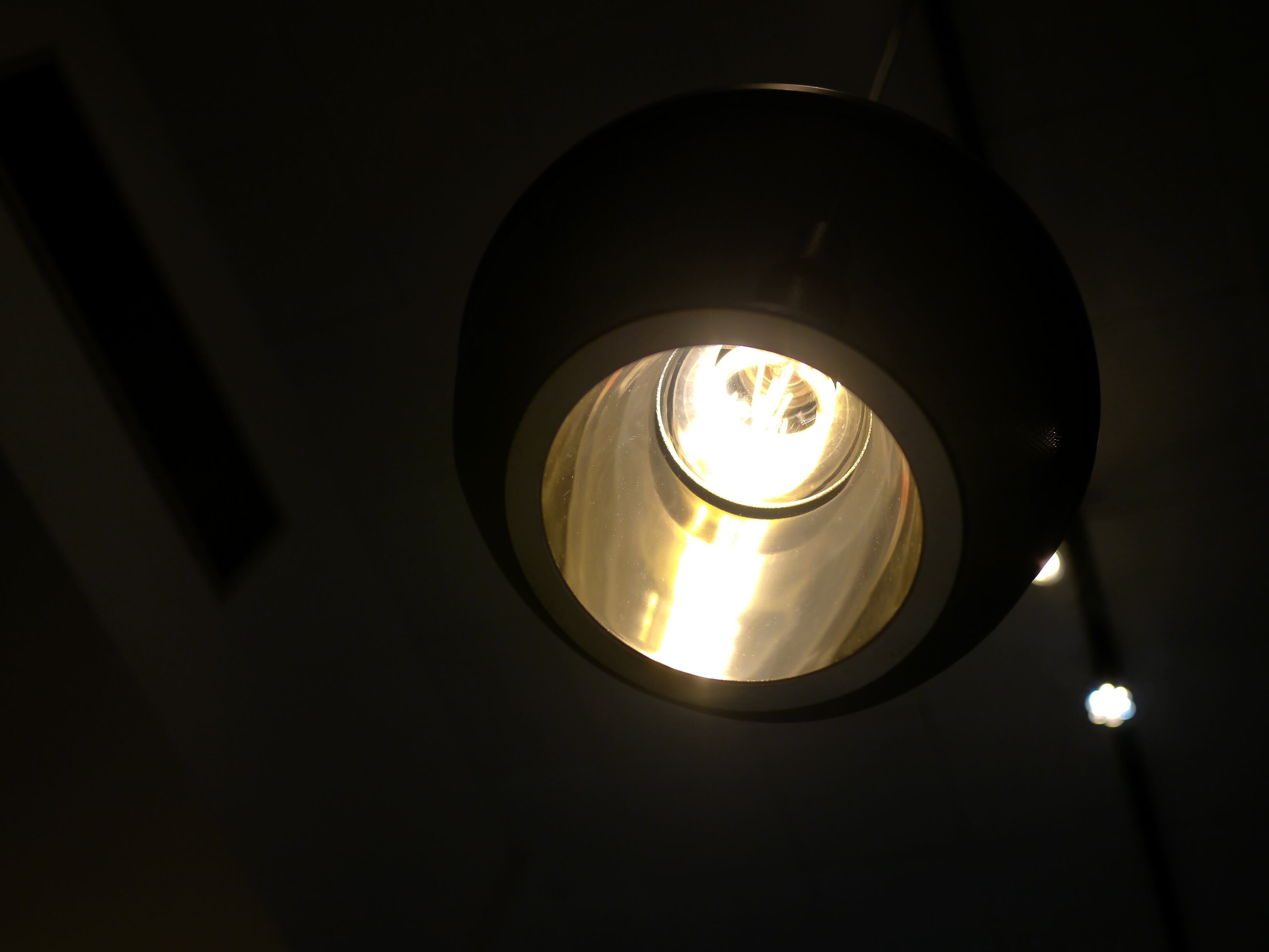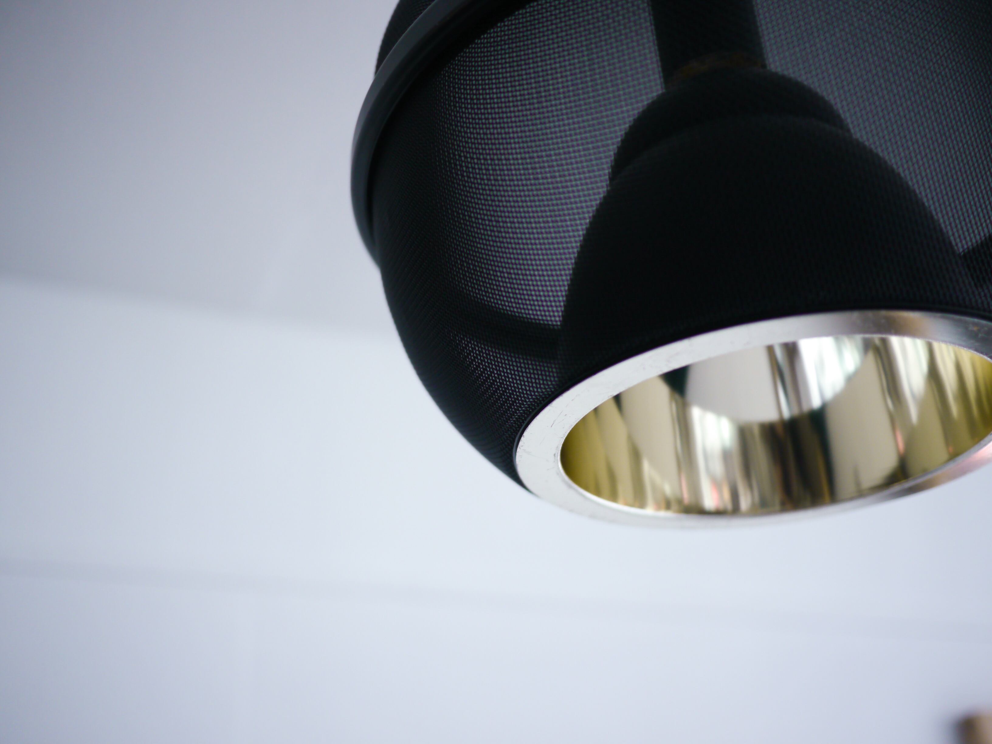 ゴールドのシリンダー形リフレクターを備えているため、直下へ紋様のようなリフレクターに反射したきらびやかな光が灯されます。真横からは数センチのスリットからもれる光が見え、メタルの素材間ながら温かな印象があります。ダイニングなどでのご使用がおススメです。
