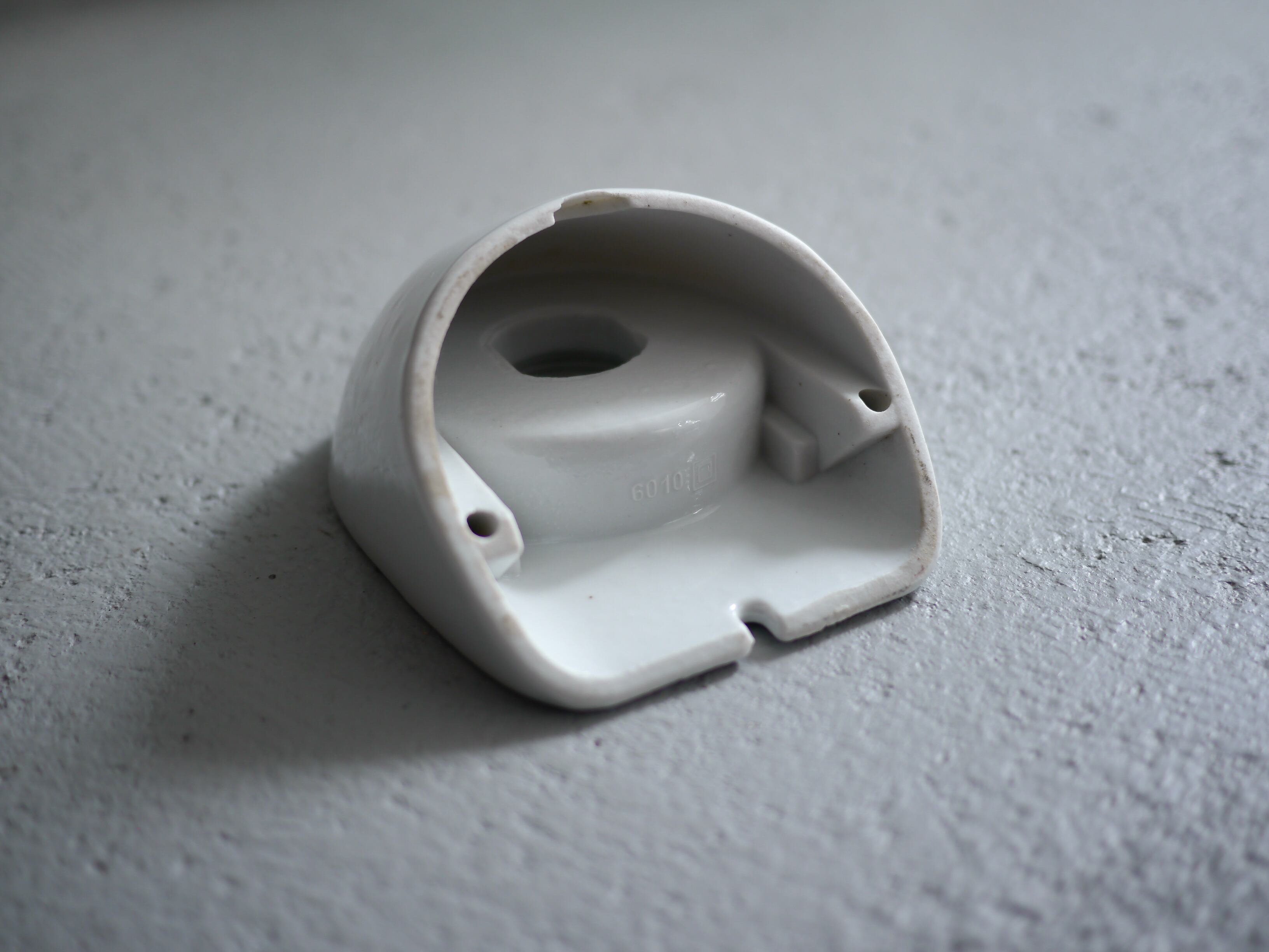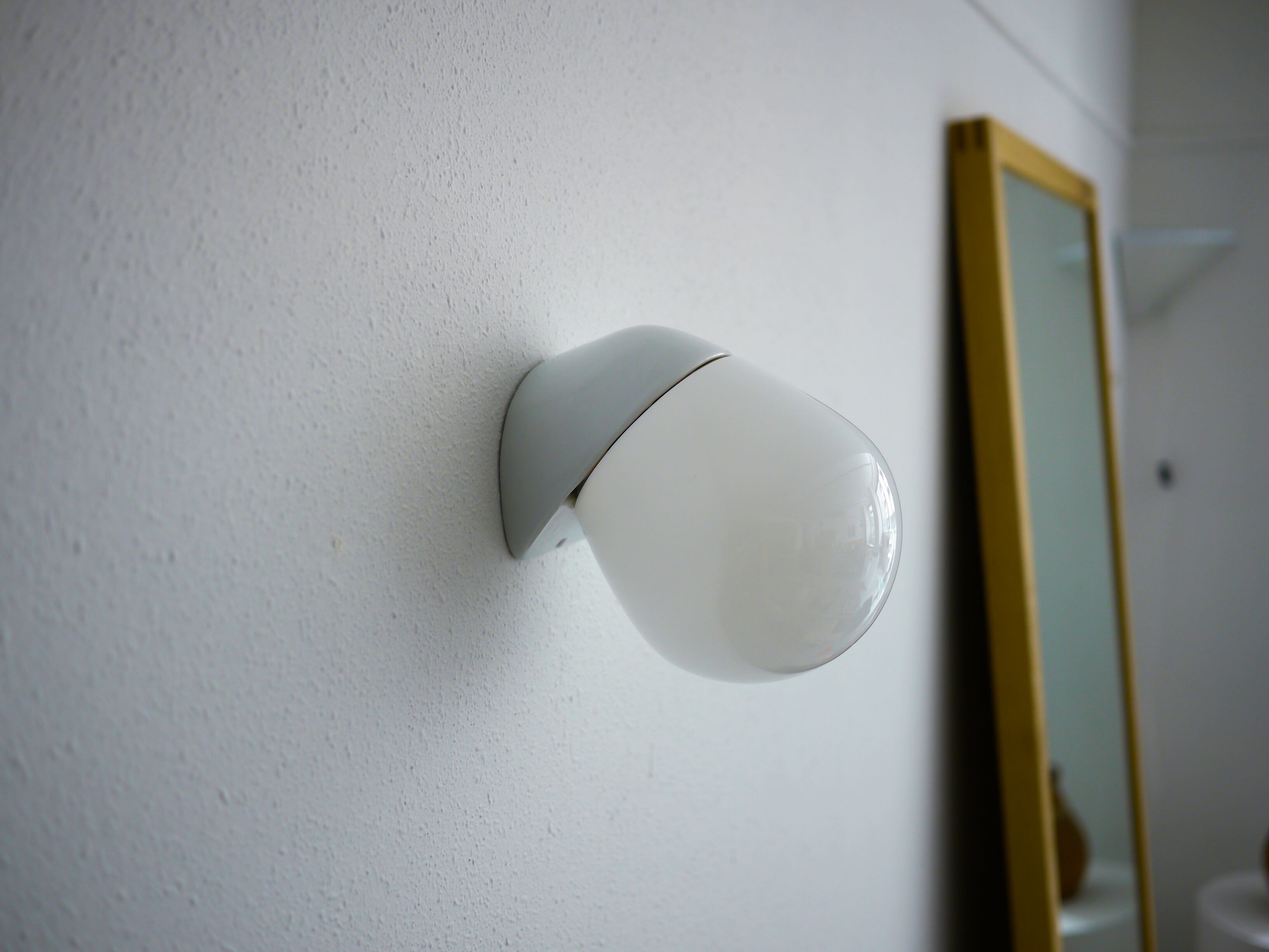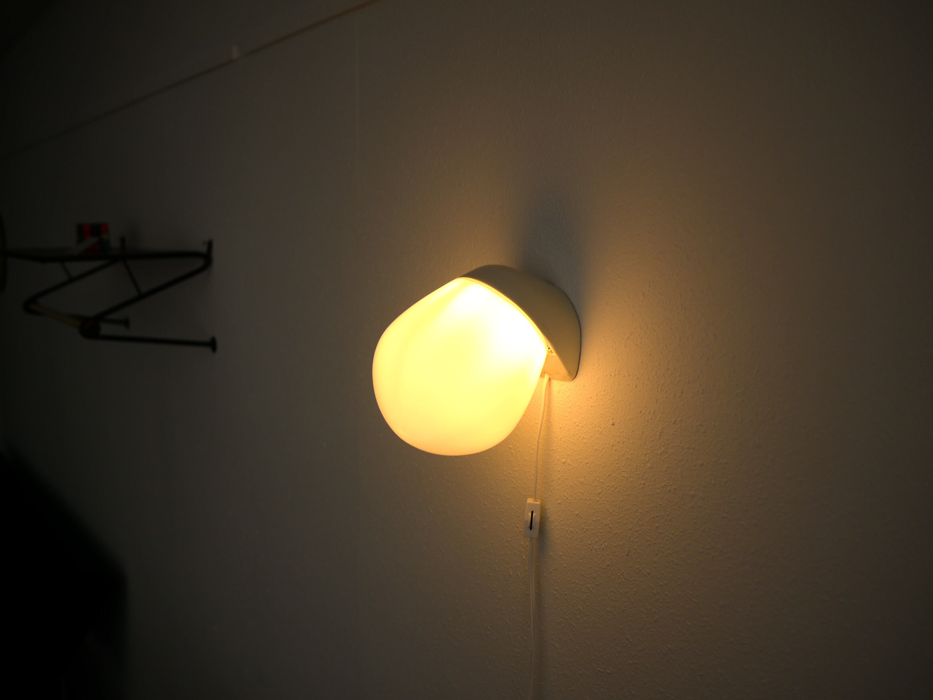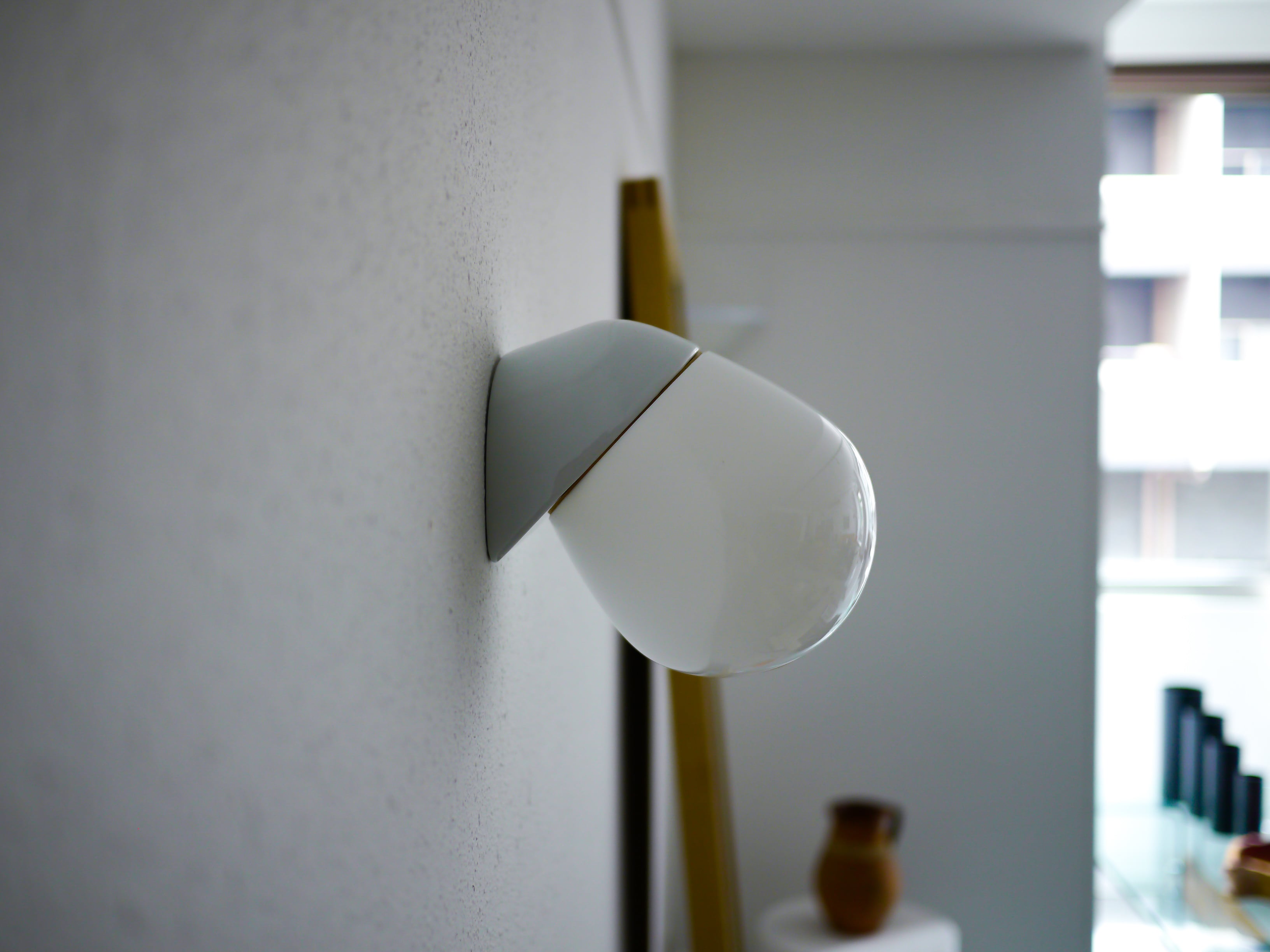 こちらの6010はどこか生き物の様な形が愛らしい、ウォールランプタイプ。シンプルで洗練された陶器製の台座と、乳白のガラスを通る優しい光が静かに存在感を放つプロダクト。台座に6010の刻印があります。また、前の使用環境によるコードを逃がしていたであろう微細なクラックが見受けられますが、壁に取り付けた場合そこまで目立つものではありません。こちらのBにはガラスシェードにパッキンが付きますが、屋外での使用はできません。