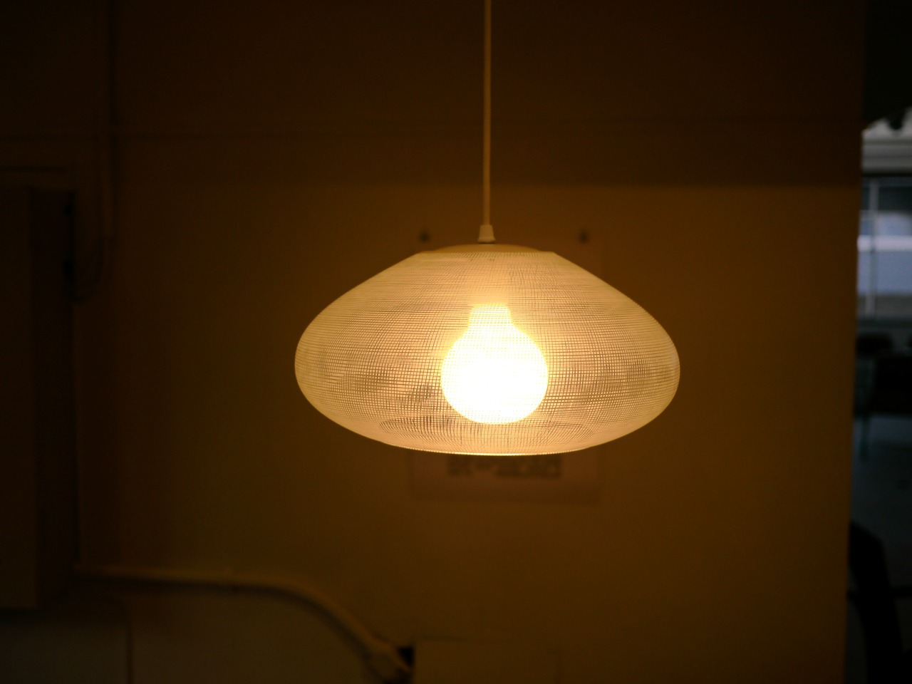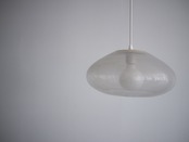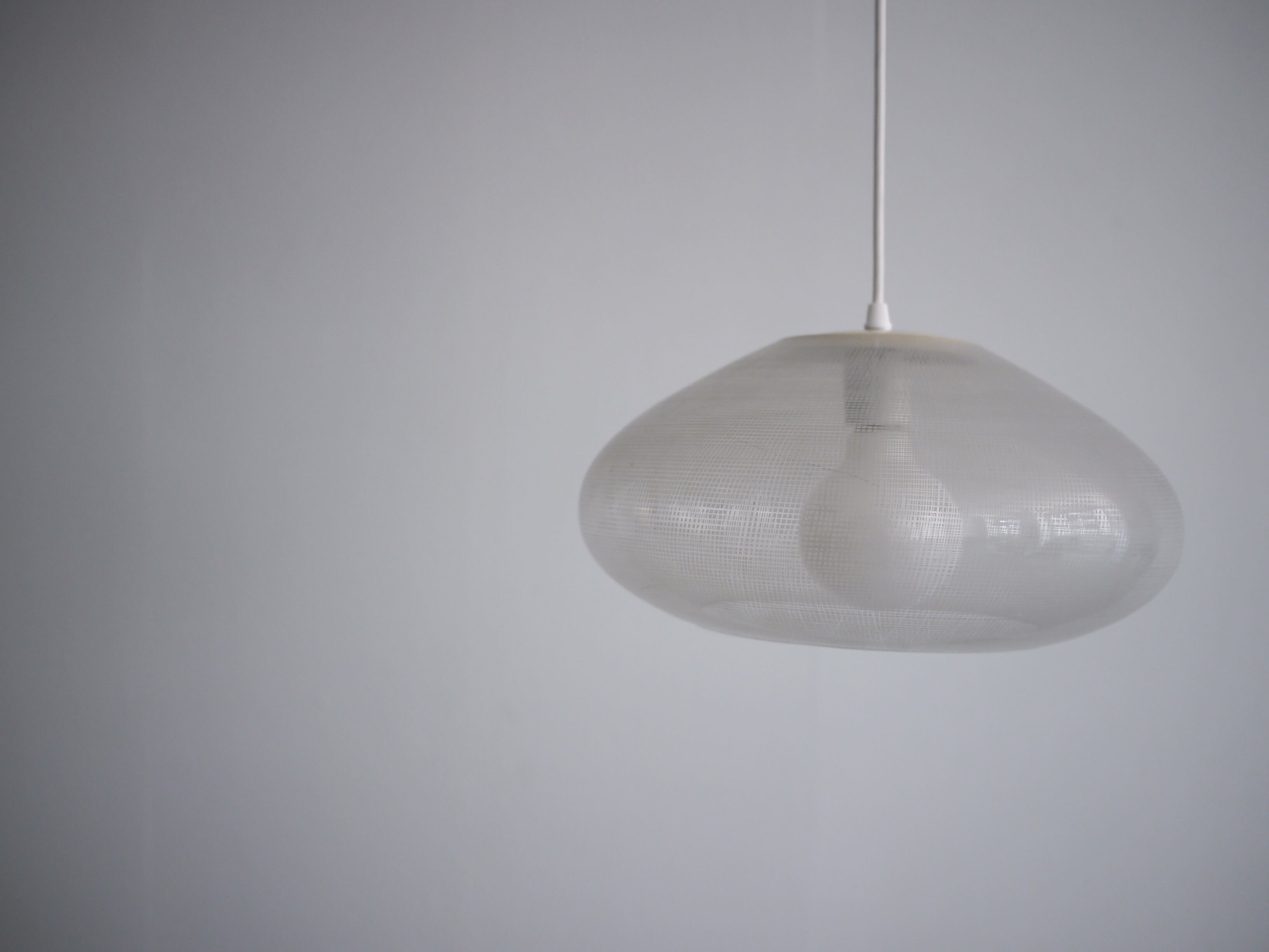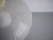 モザイクの様なランダムな模様がガラスに施してあり光を灯すと反射で模様が浮かび上がります。品のある楕円形のシェイプとシンプルな質感で様々なダイニングシーンに合わせやすいと思います。電球が透けて見えるデザインなので、60W相当のLEDのボール球を合わせてみました。こちらもセットでの販売となります。