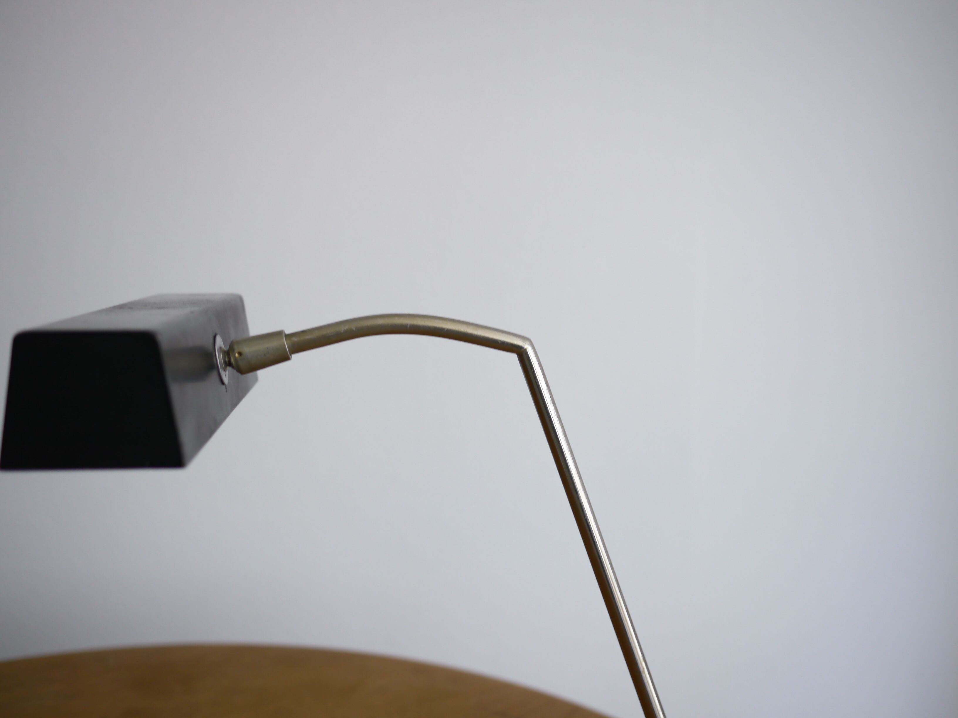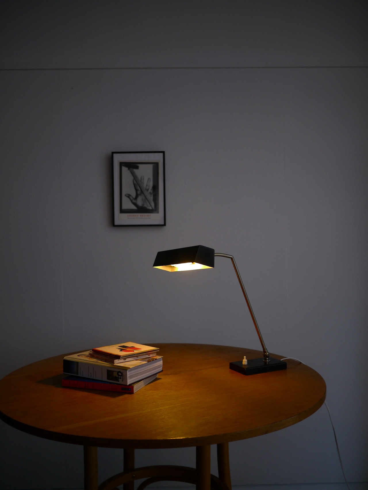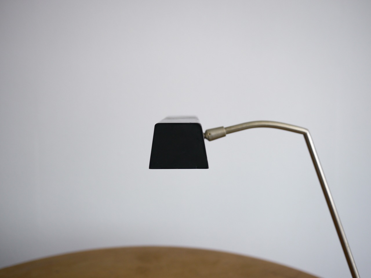 オランダにて買い付けましたデスクランプです。バウハウスなどのドイツらしい雰囲気とアメリカンミッドセンチュリーらしい雰囲気を併せ持ちながら、コンパクトで上品な佇まいのデスクランプ。