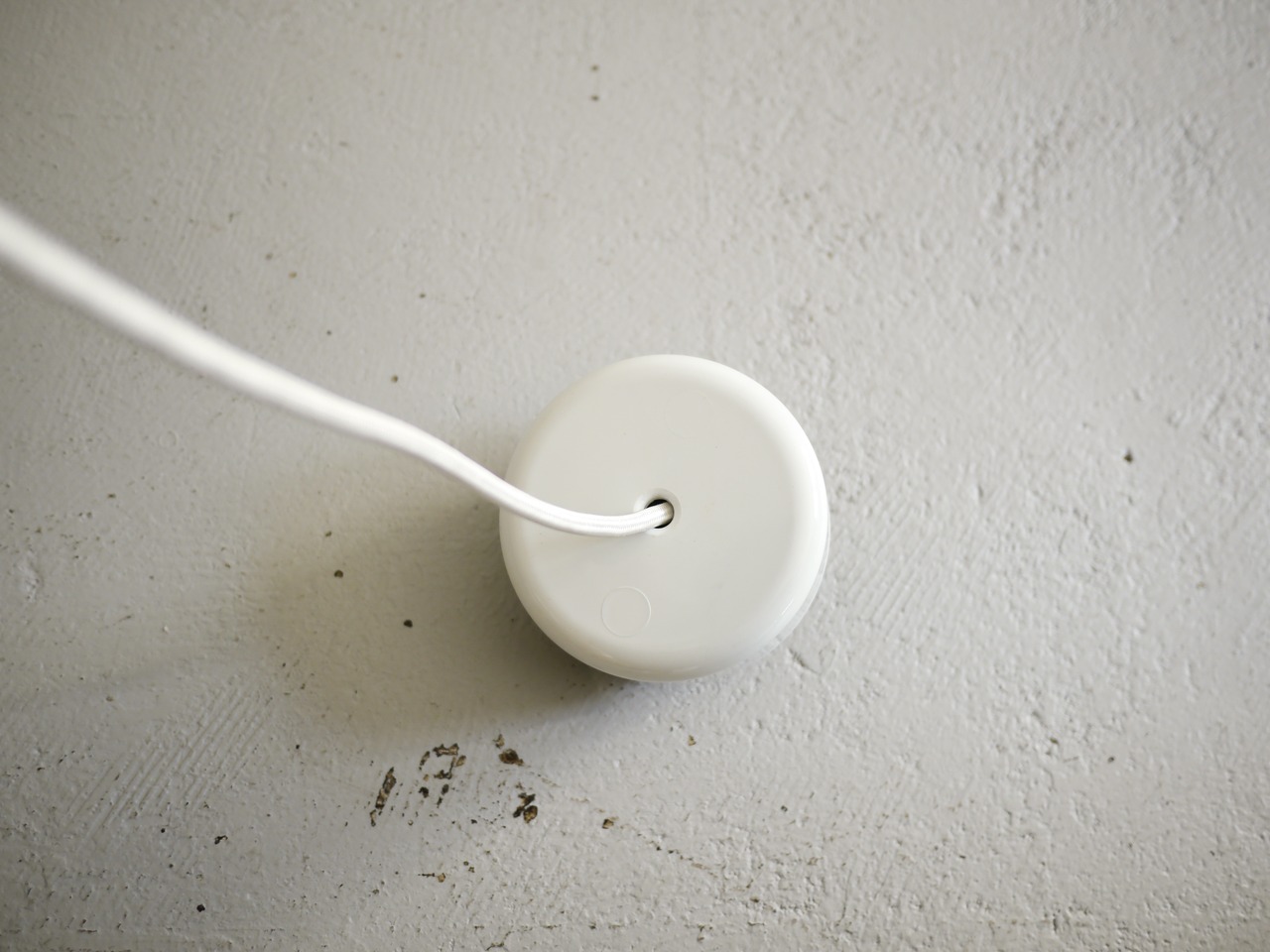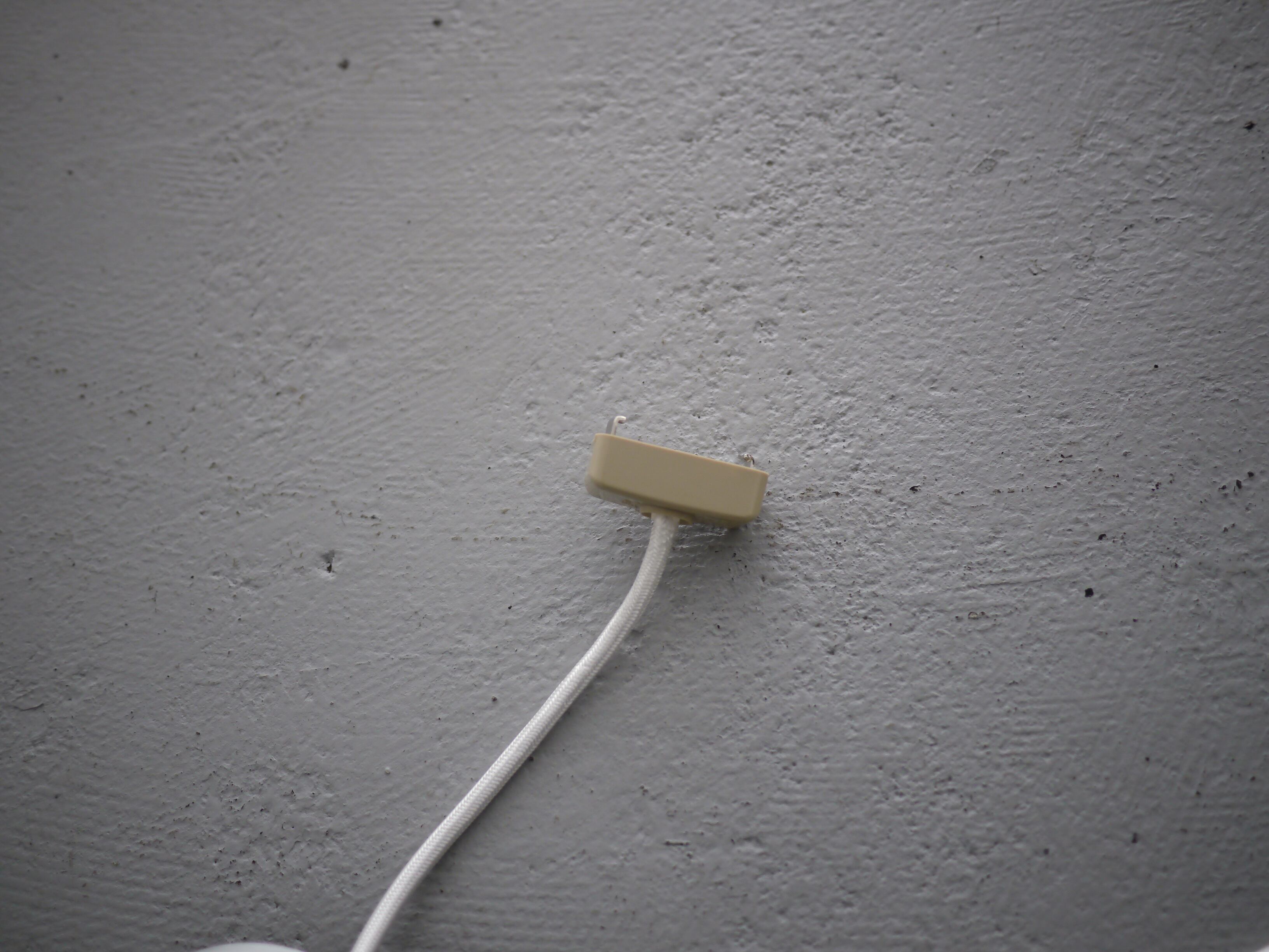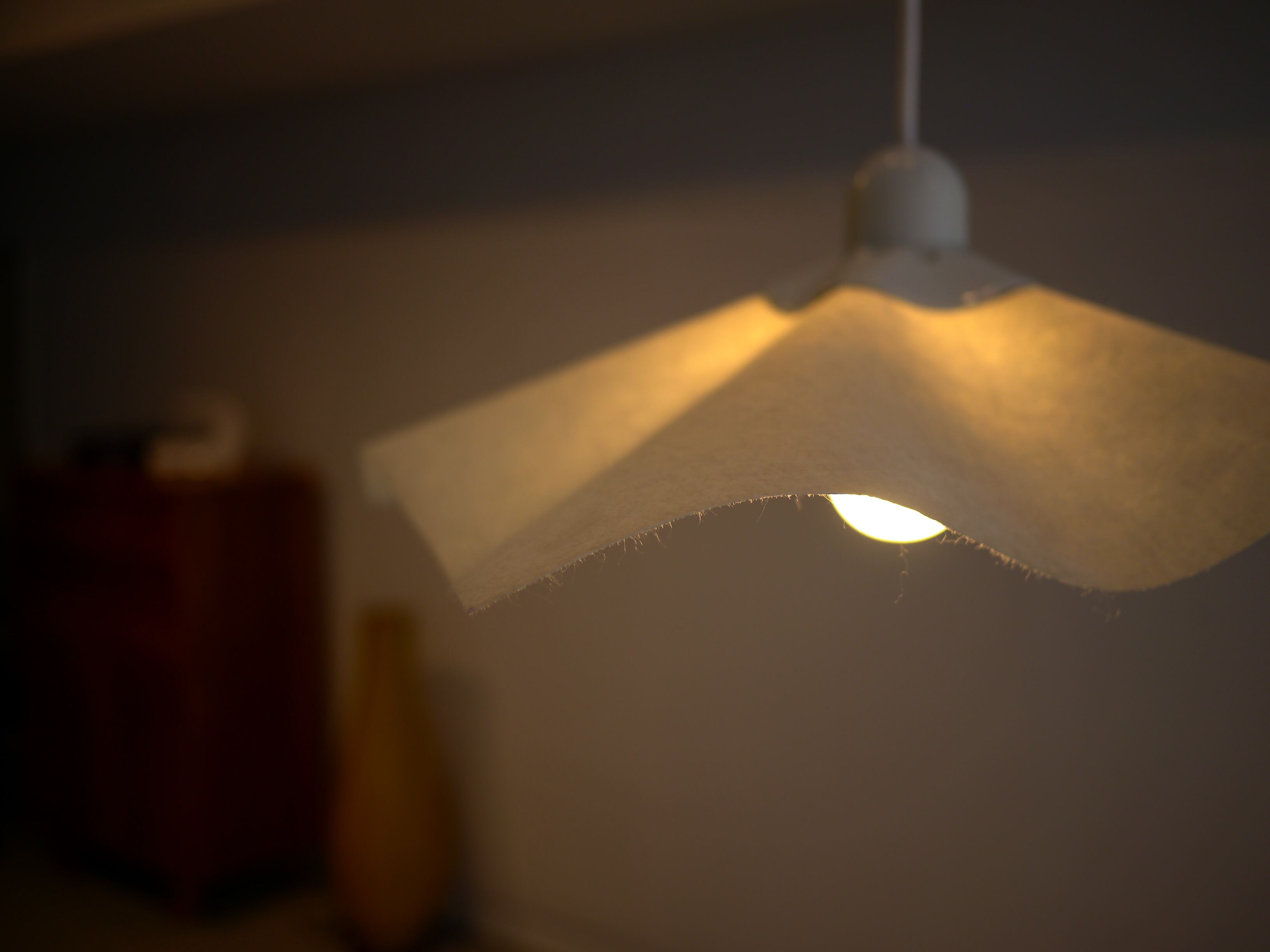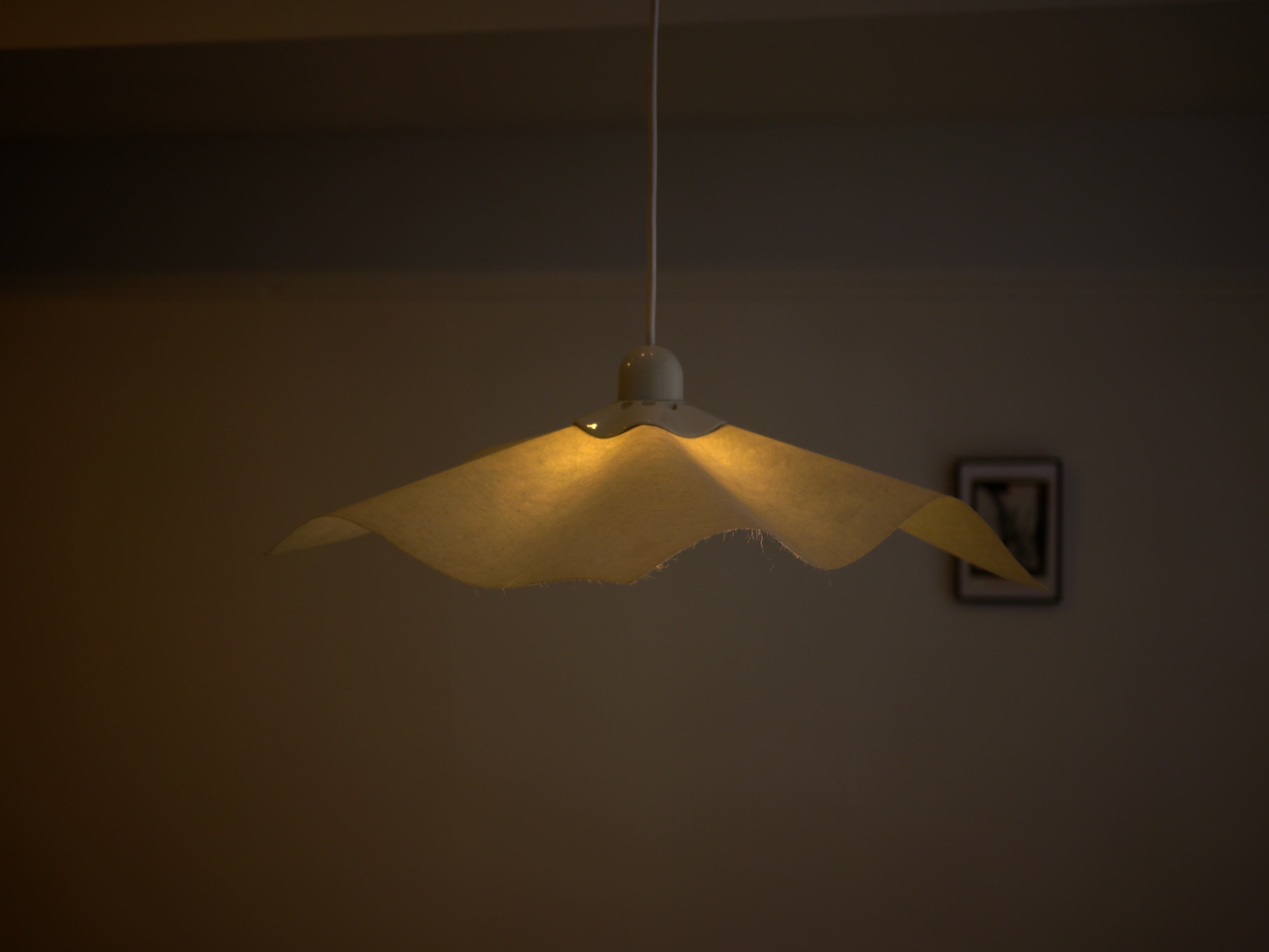 こちらは通常のペンダントタイプ、引っかけシーリング仕様、専用のカバーを使用しての直付け仕様がお選びいただけます。ご購入時にご希望をお伝えください。シェード中央部に多少のよれがありますが、そこまで目立ったものではありません。