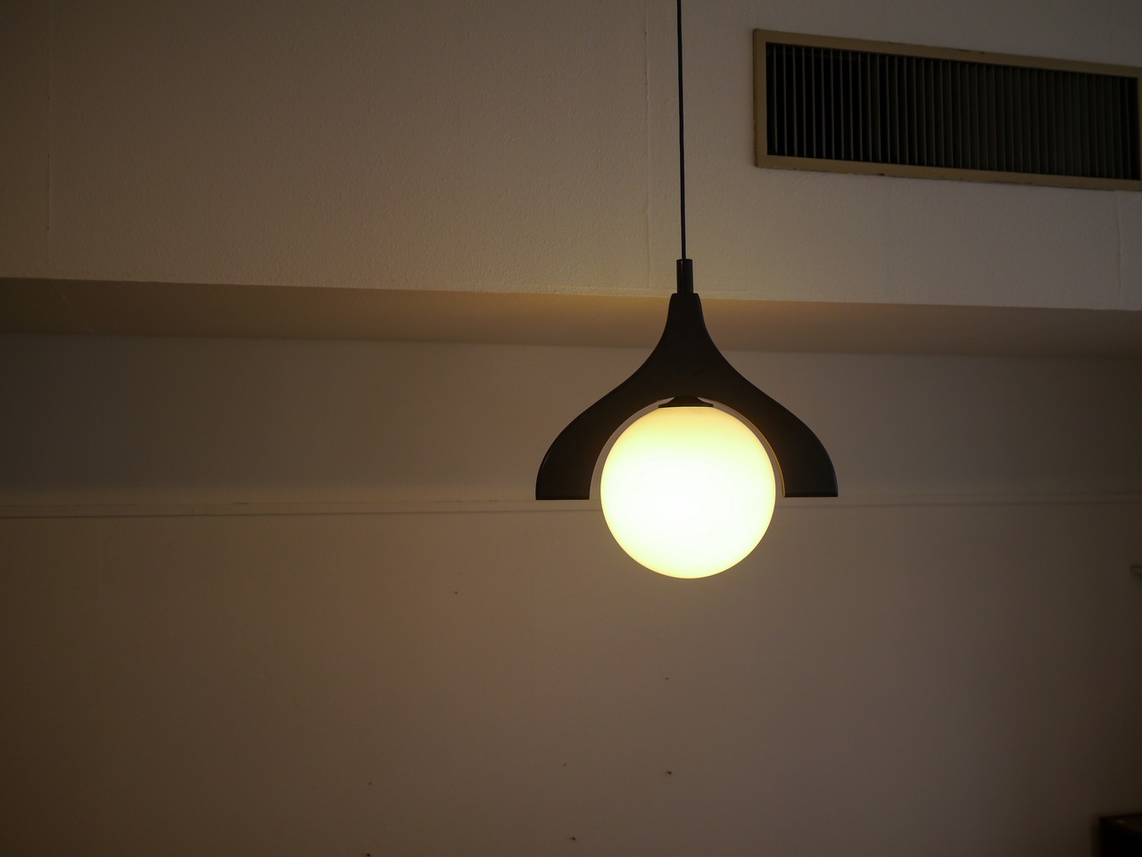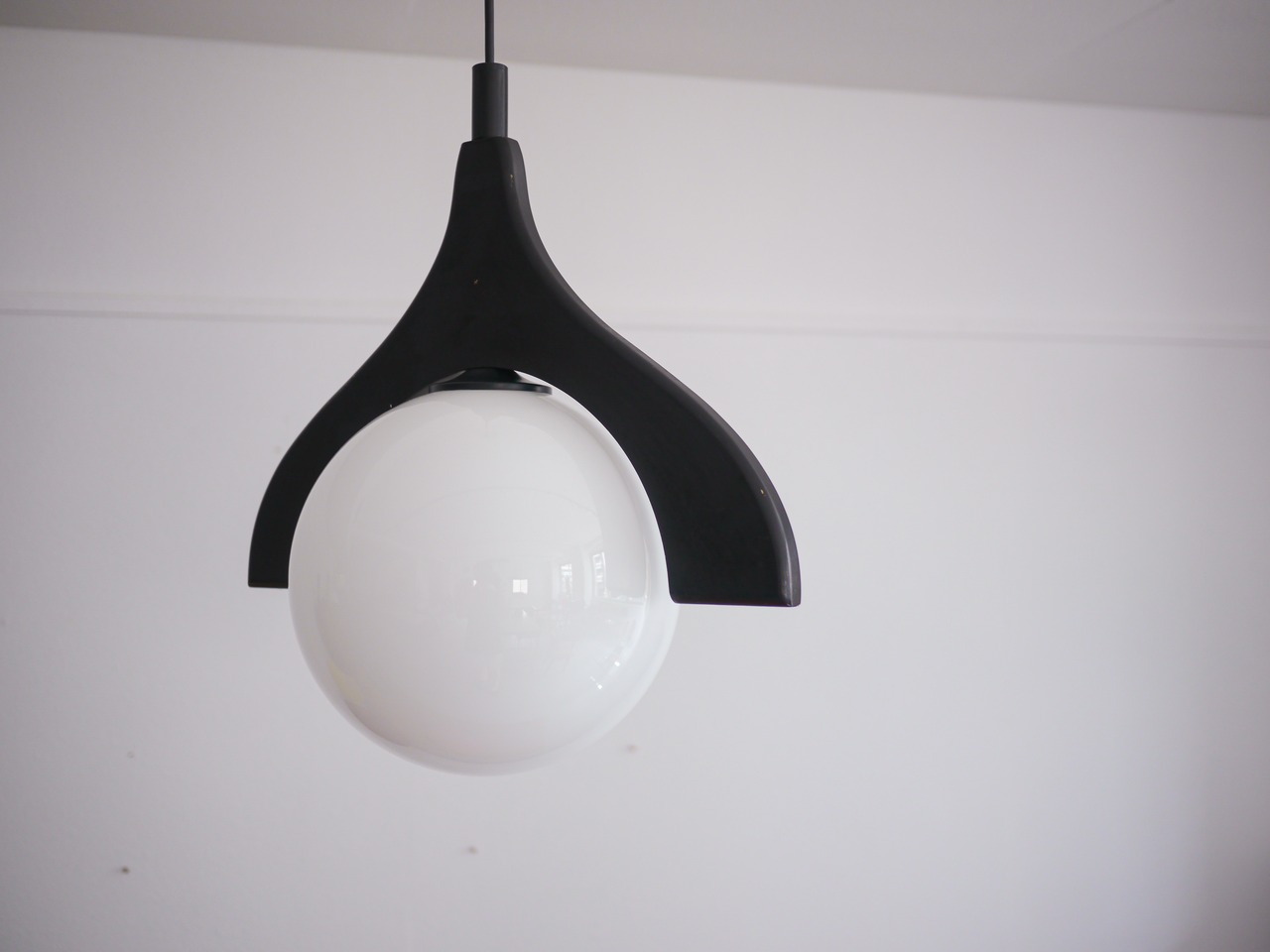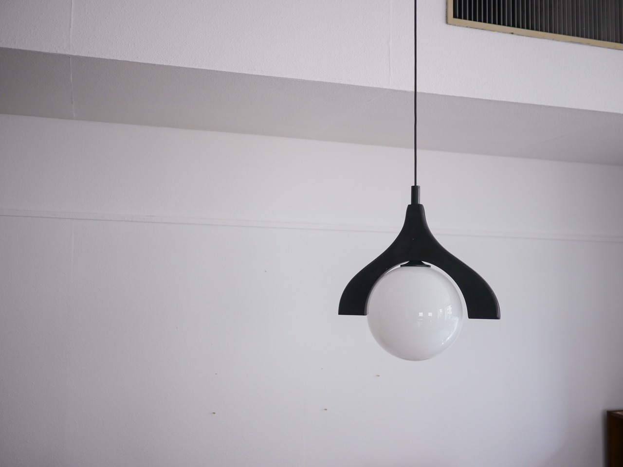 大胆なボール状の乳白ガラスのシェードにブラックのボディが個性的で遊び心のあるランプ。70-80年代のアイテムかと思われます。ボディ部分はウッドでブラックに塗装されています。明るさも取りやすく、長めに垂らしても格好の良い照明。