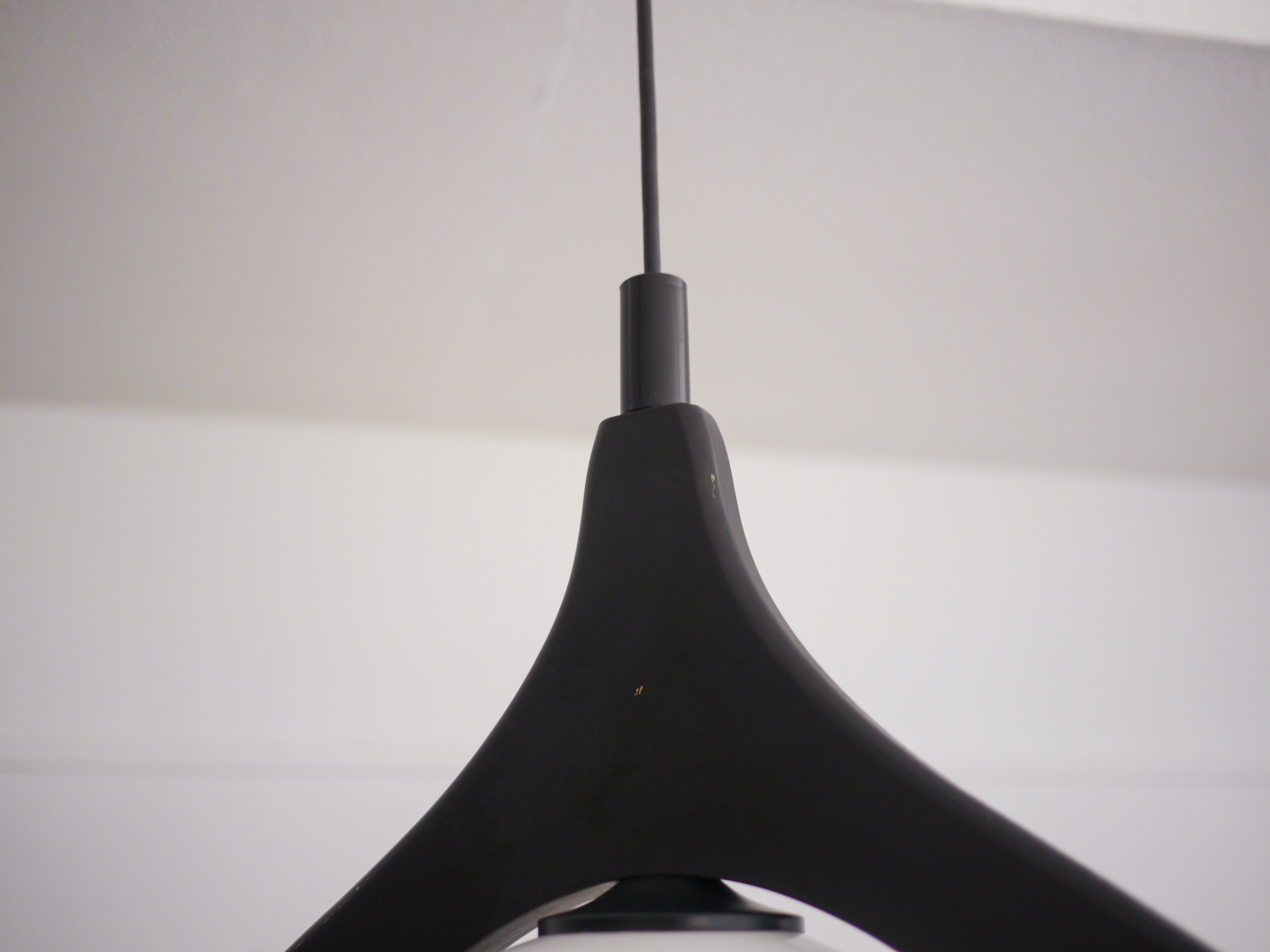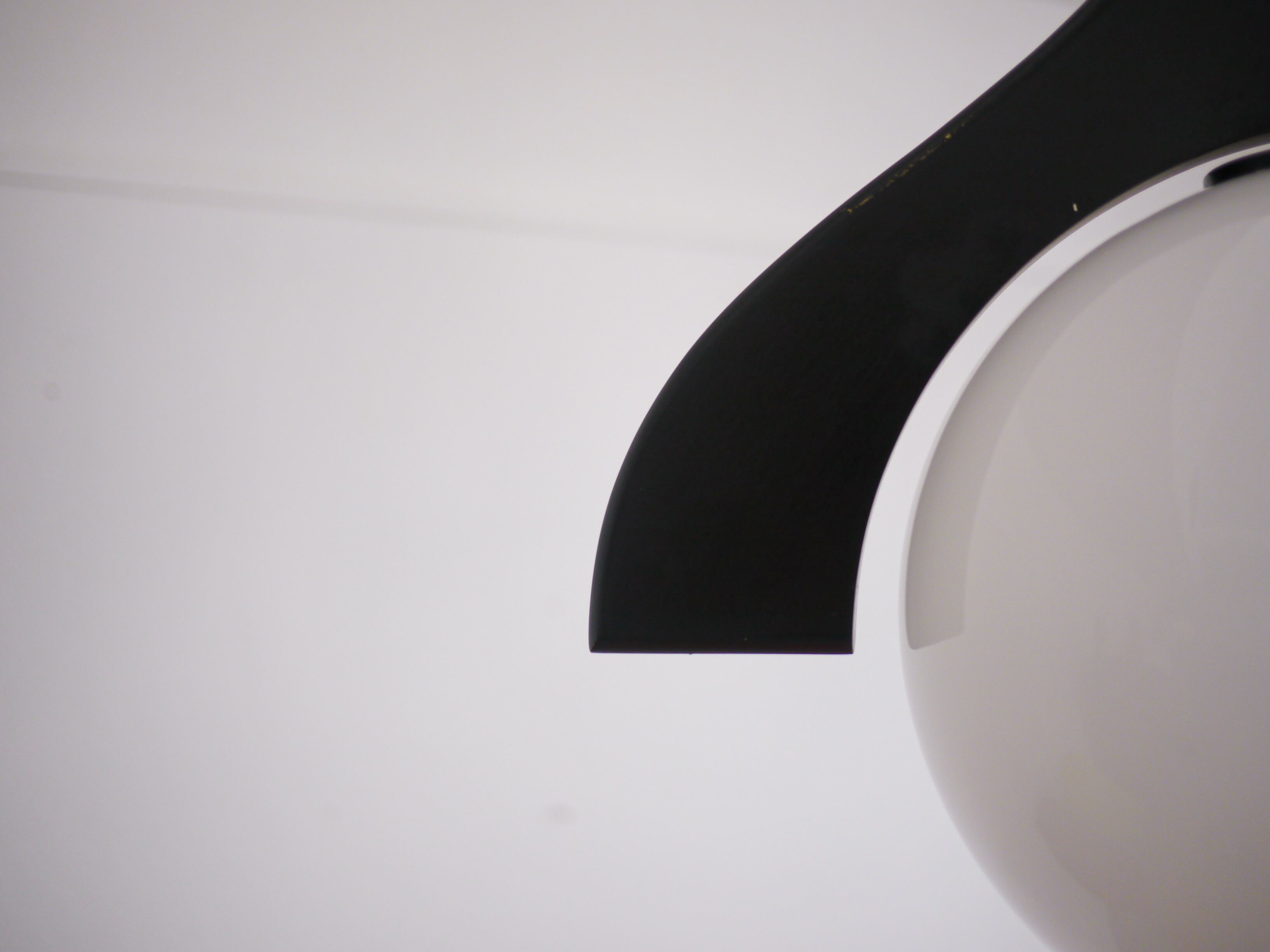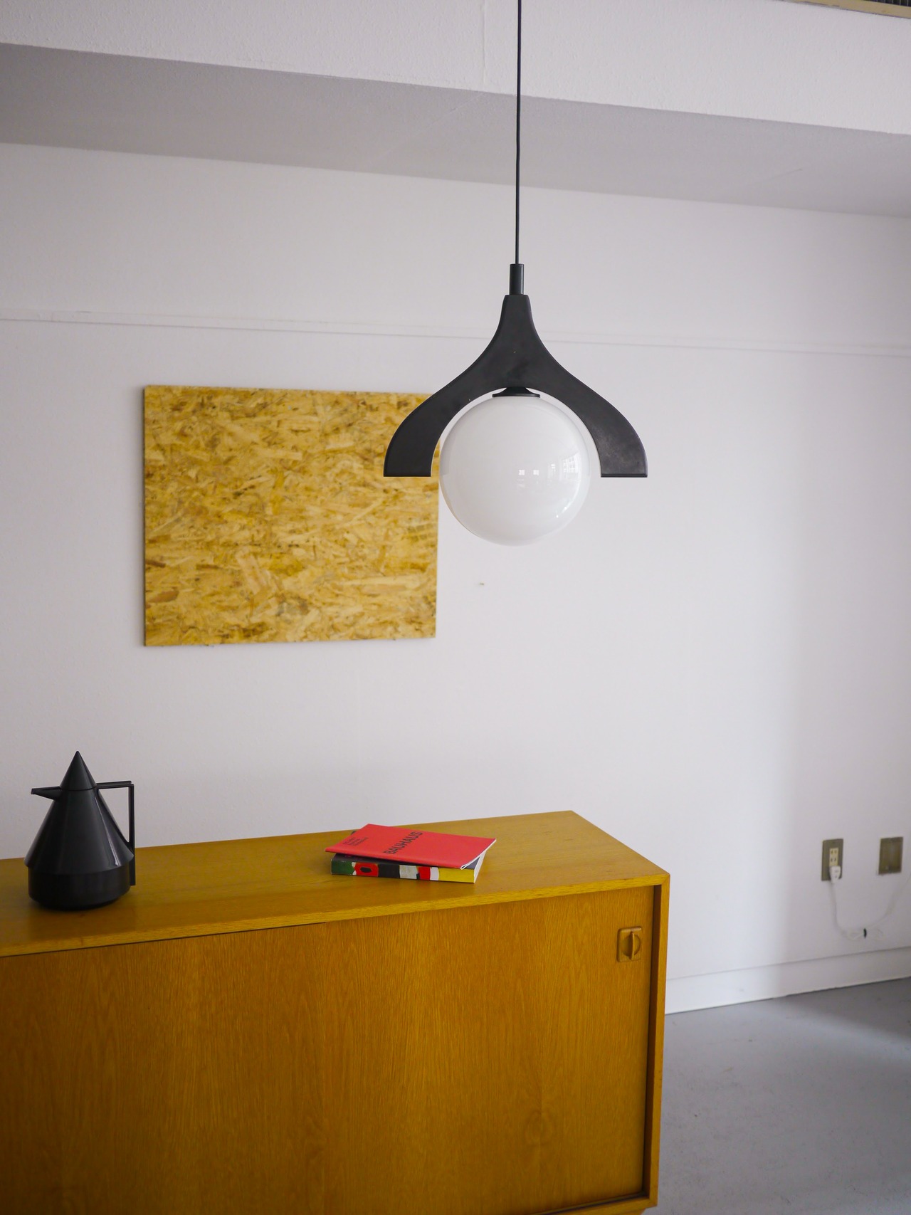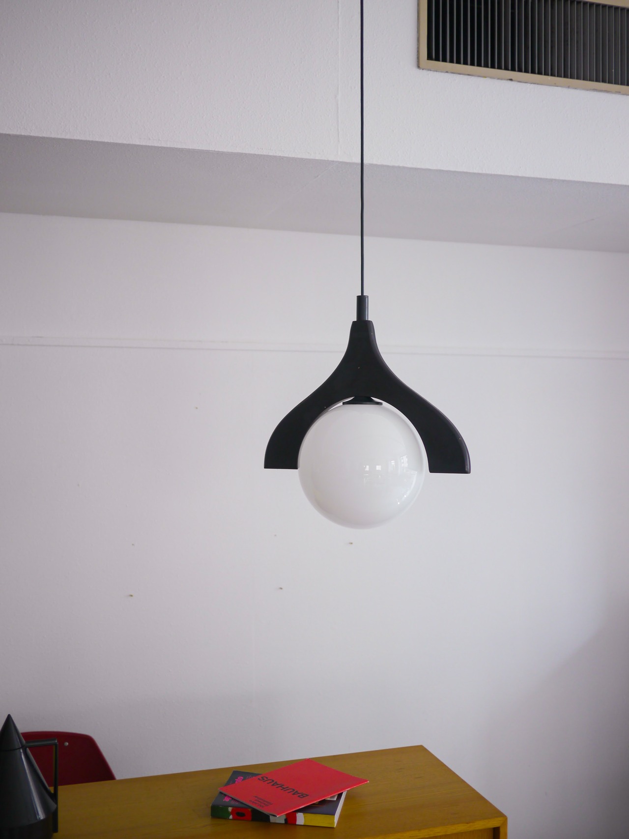 大胆なボール状の乳白ガラスのシェードにブラックのボディが個性的で遊び心のあるランプ。70-80年代のアイテムかと思われます。ボディ部分はウッドでブラックに塗装されています。明るさも取りやすく、長めに垂らしても格好の良い照明。