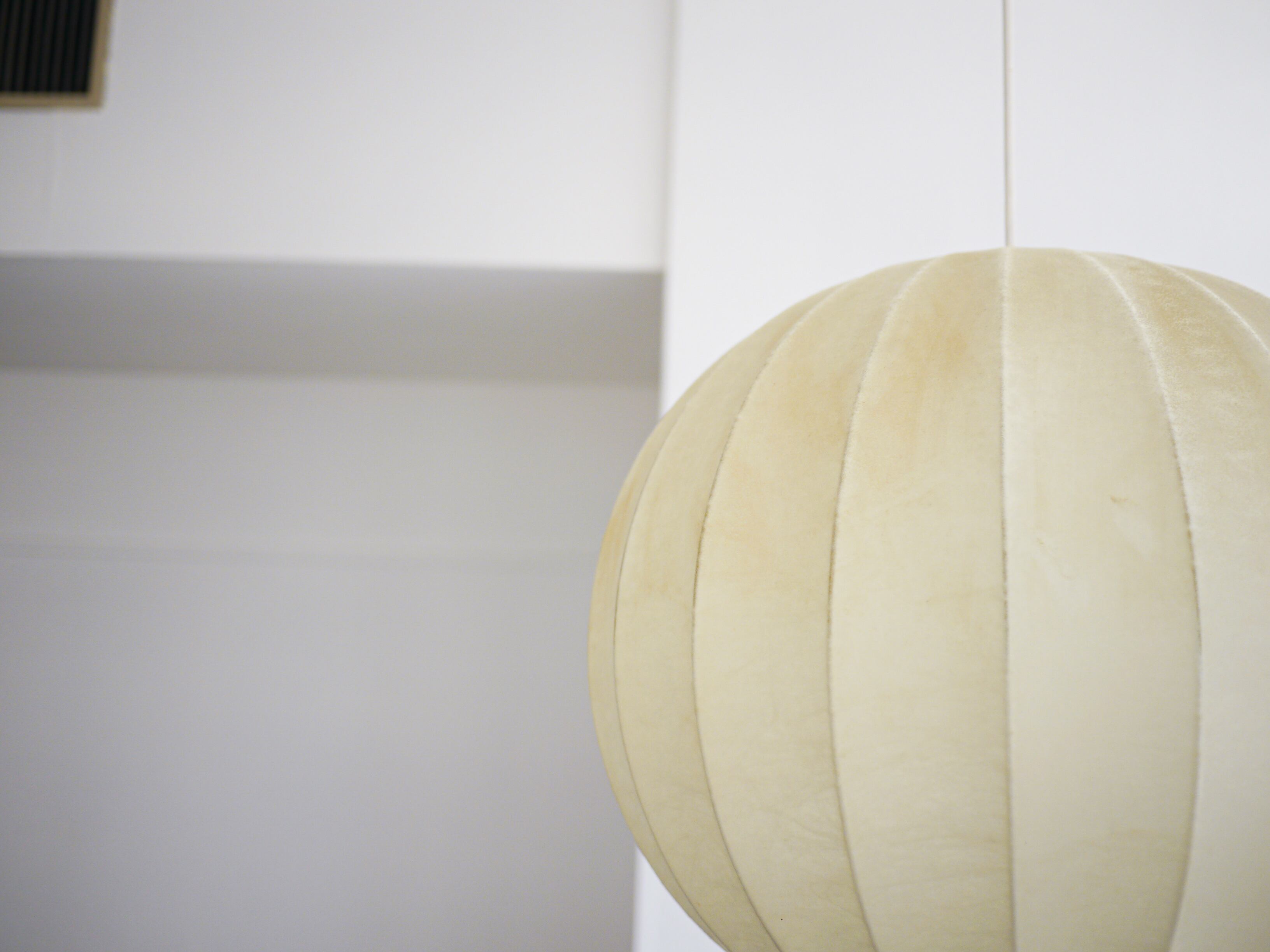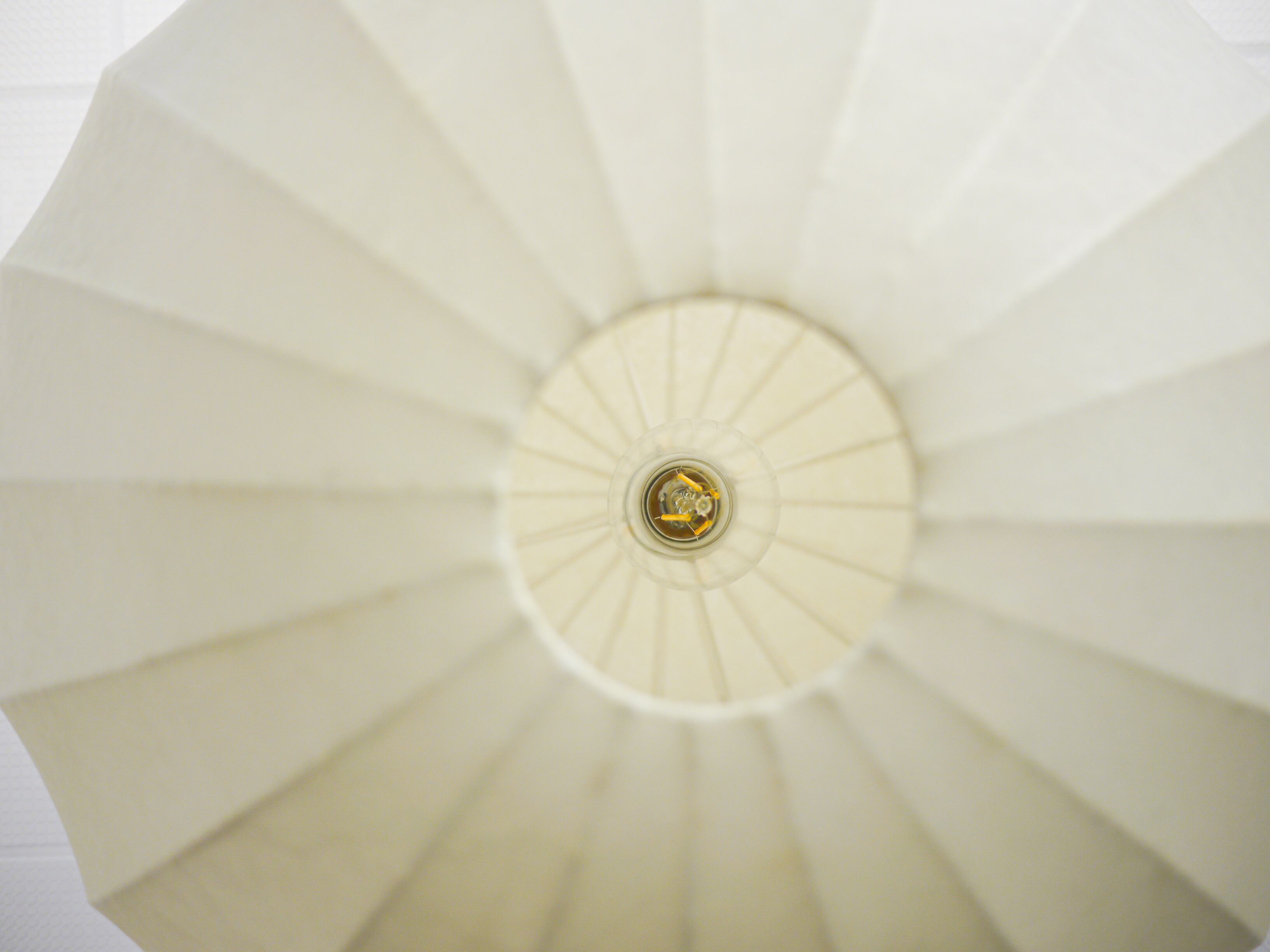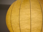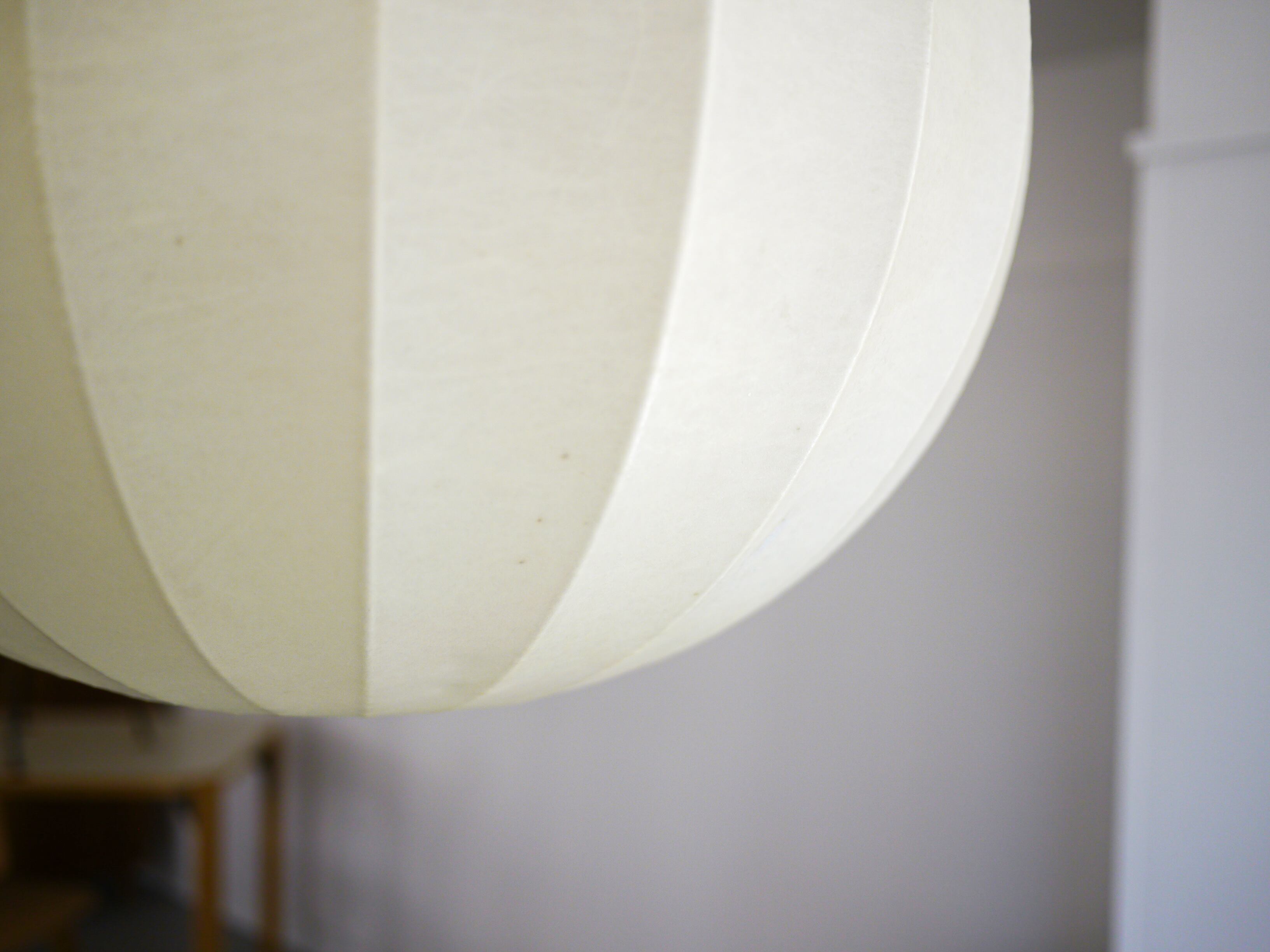 一見和紙の様ですが、50年代に発達した繊維状の樹脂をフレームに吹き付ける技法で製作されている為樹脂の被膜で出来ているこのランプ。そのために光を灯すと繊維が浮かび上がり、温かみのある雰囲気を纏います。また、紙に比べ耐久性もあり羊革のように柔らかく張りのある質感です。