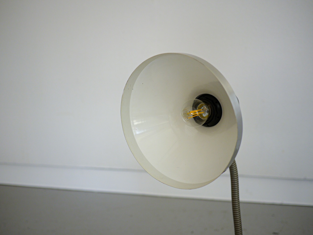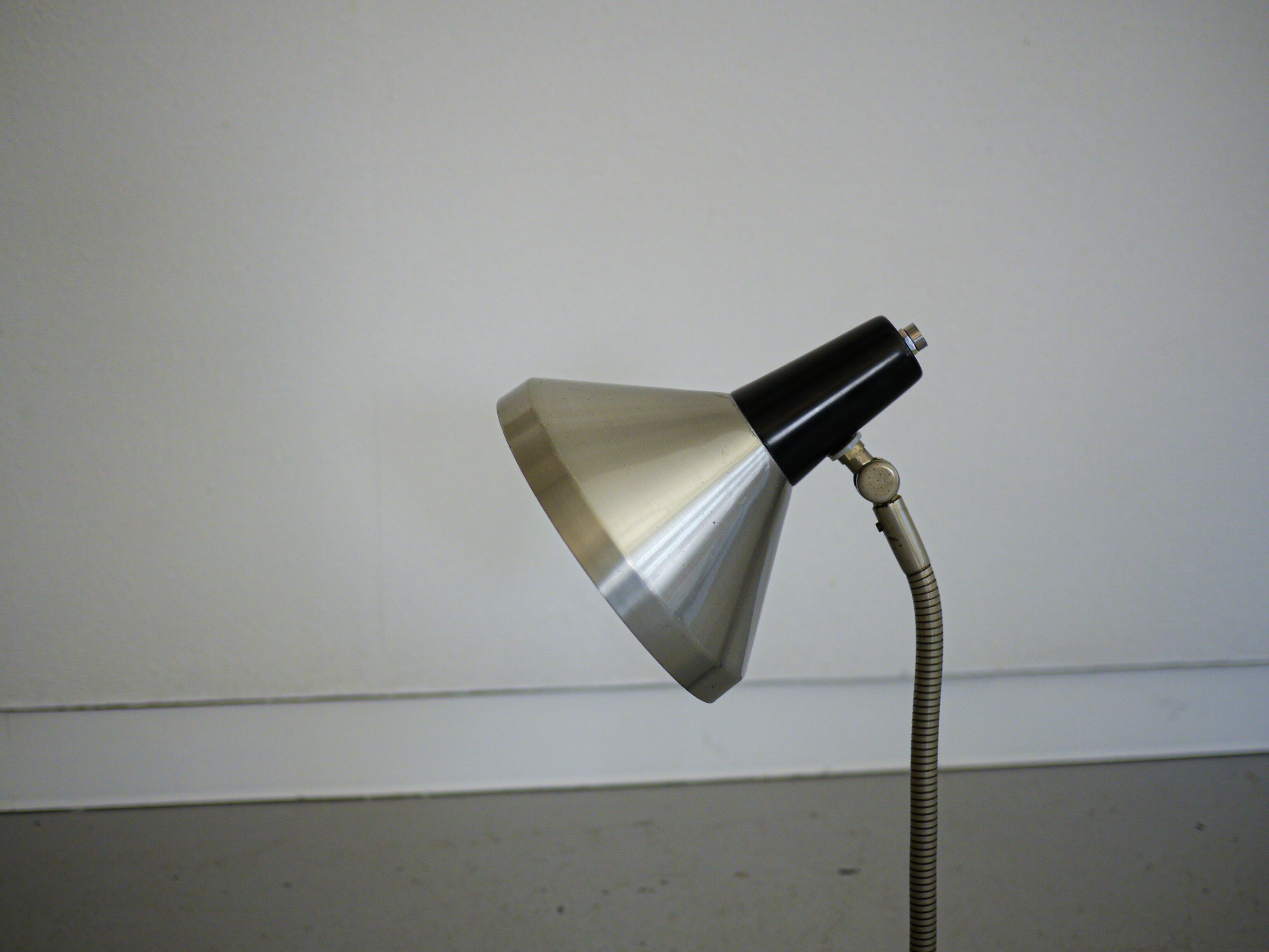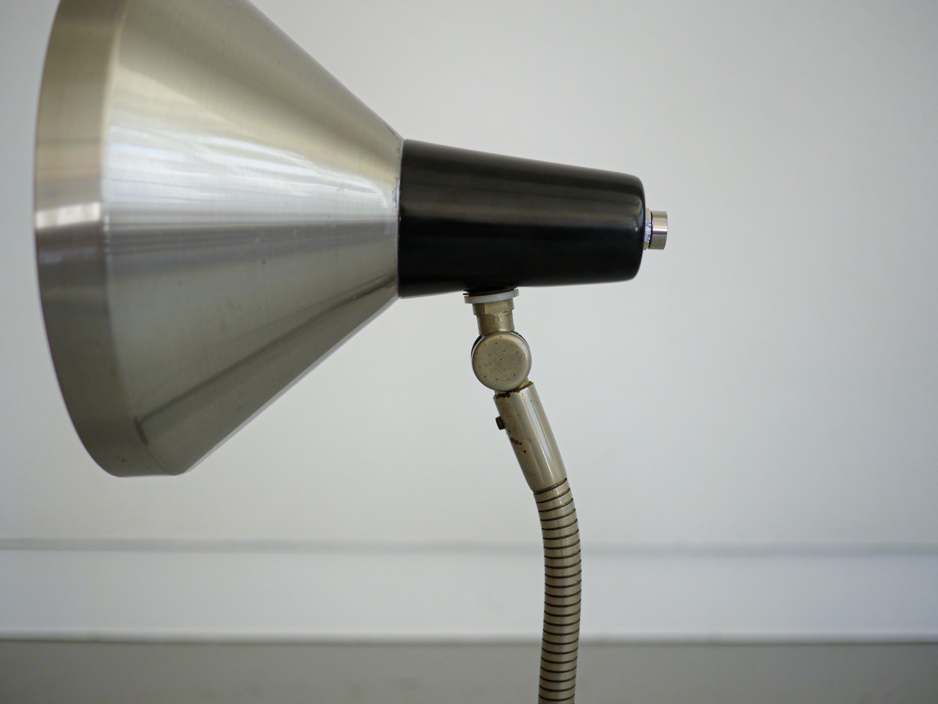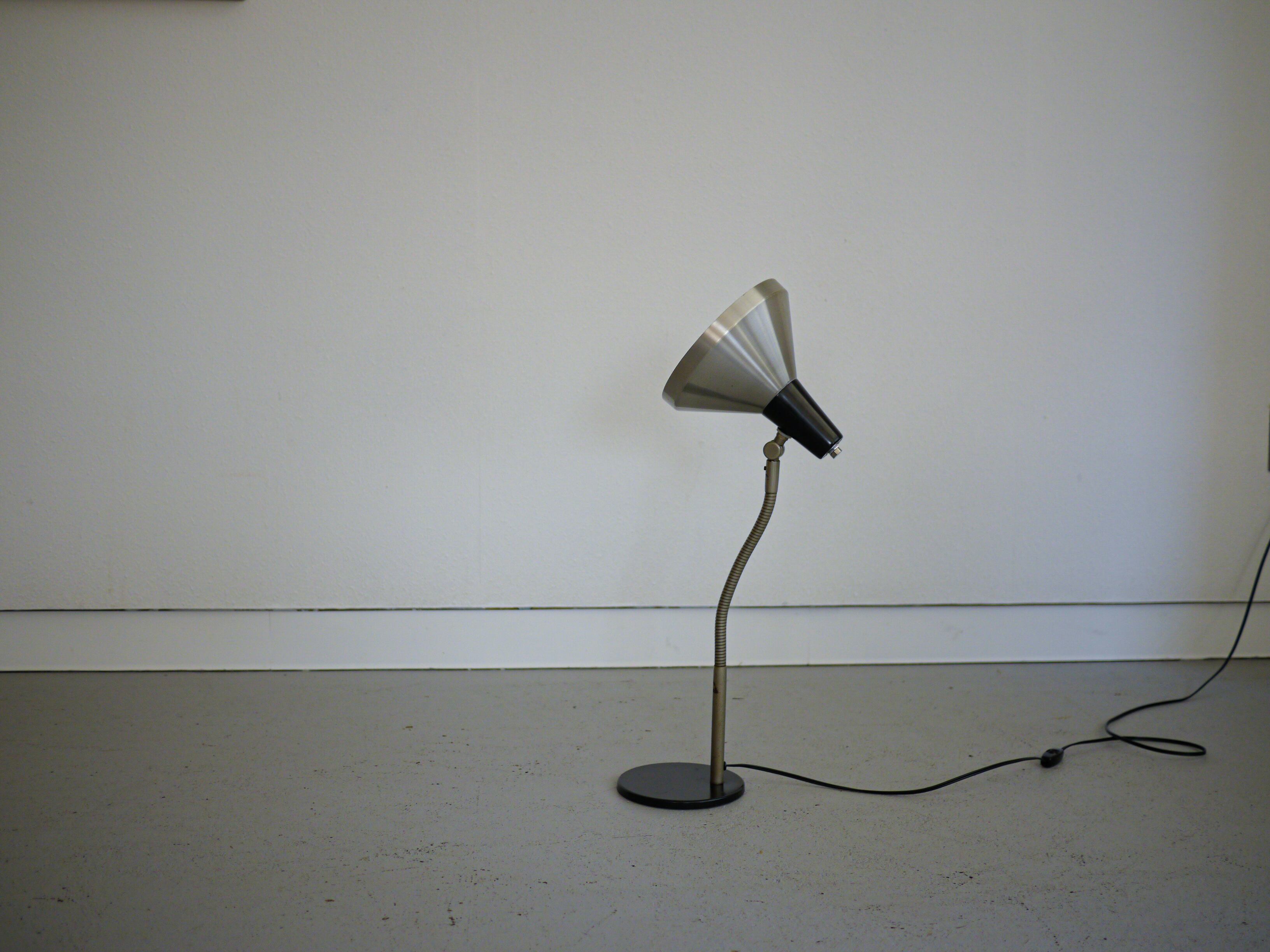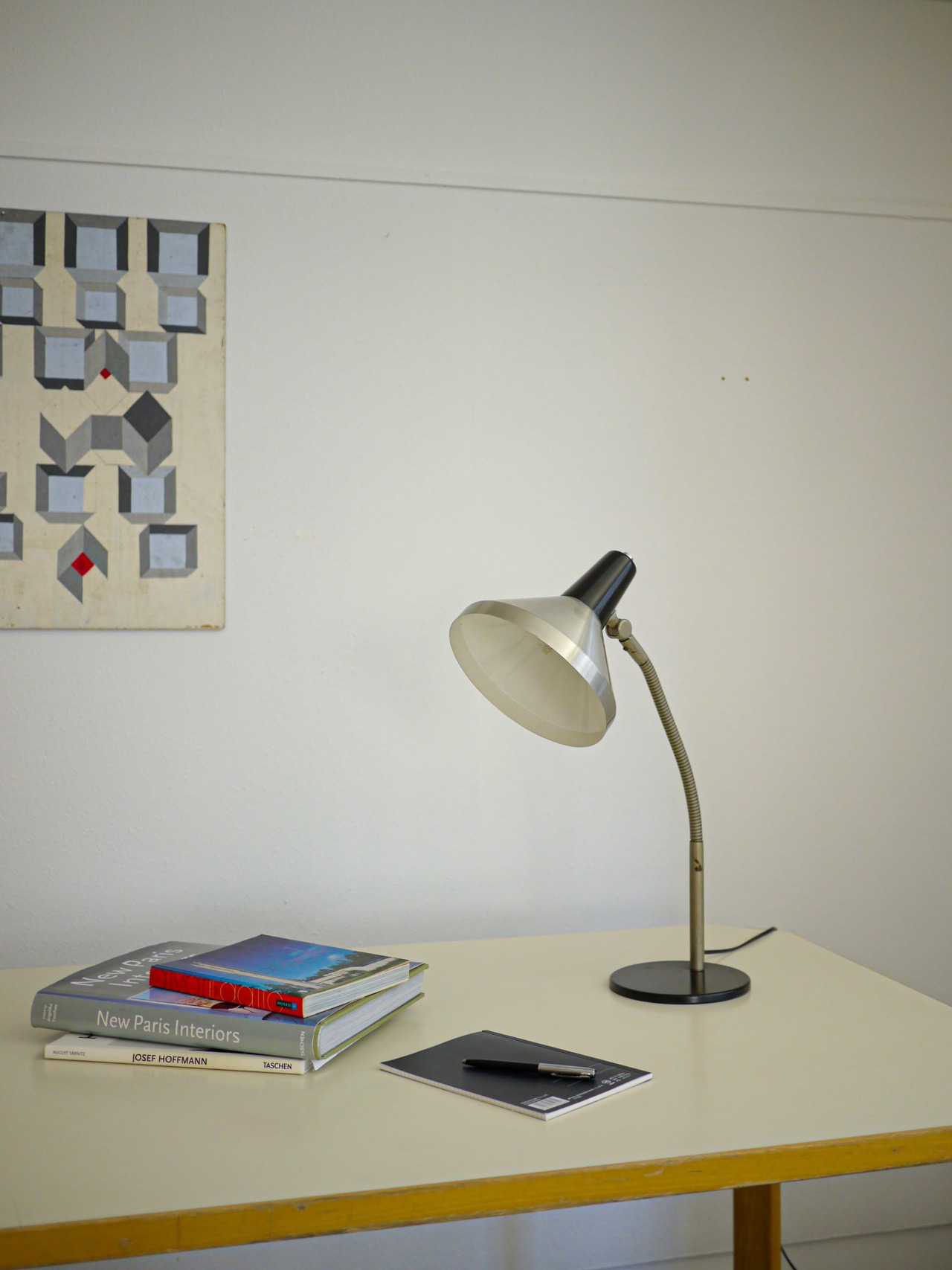 アルミ製のシェード、ブラックのスチールのトーンが程よいデスクランプ。グースネックと呼ばれる自在なアームと、首元の上下・半回転でポジションの幅も広く使いやすい設計になっています。