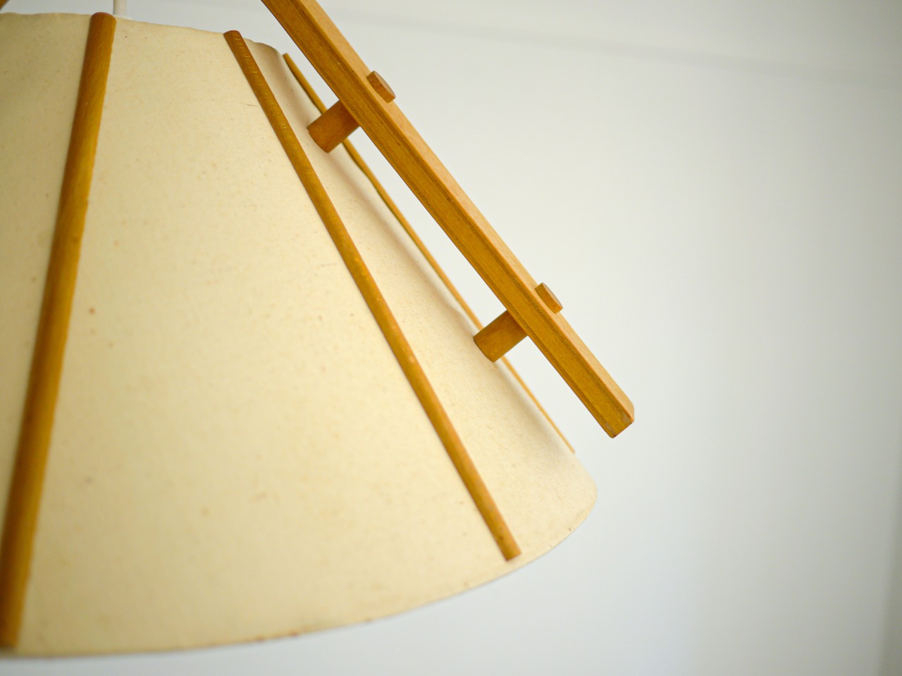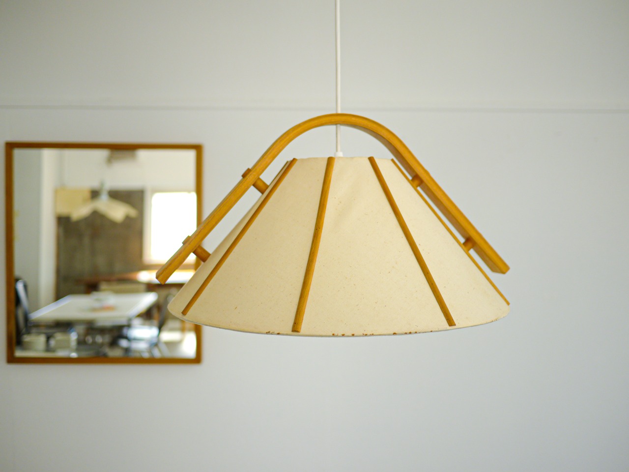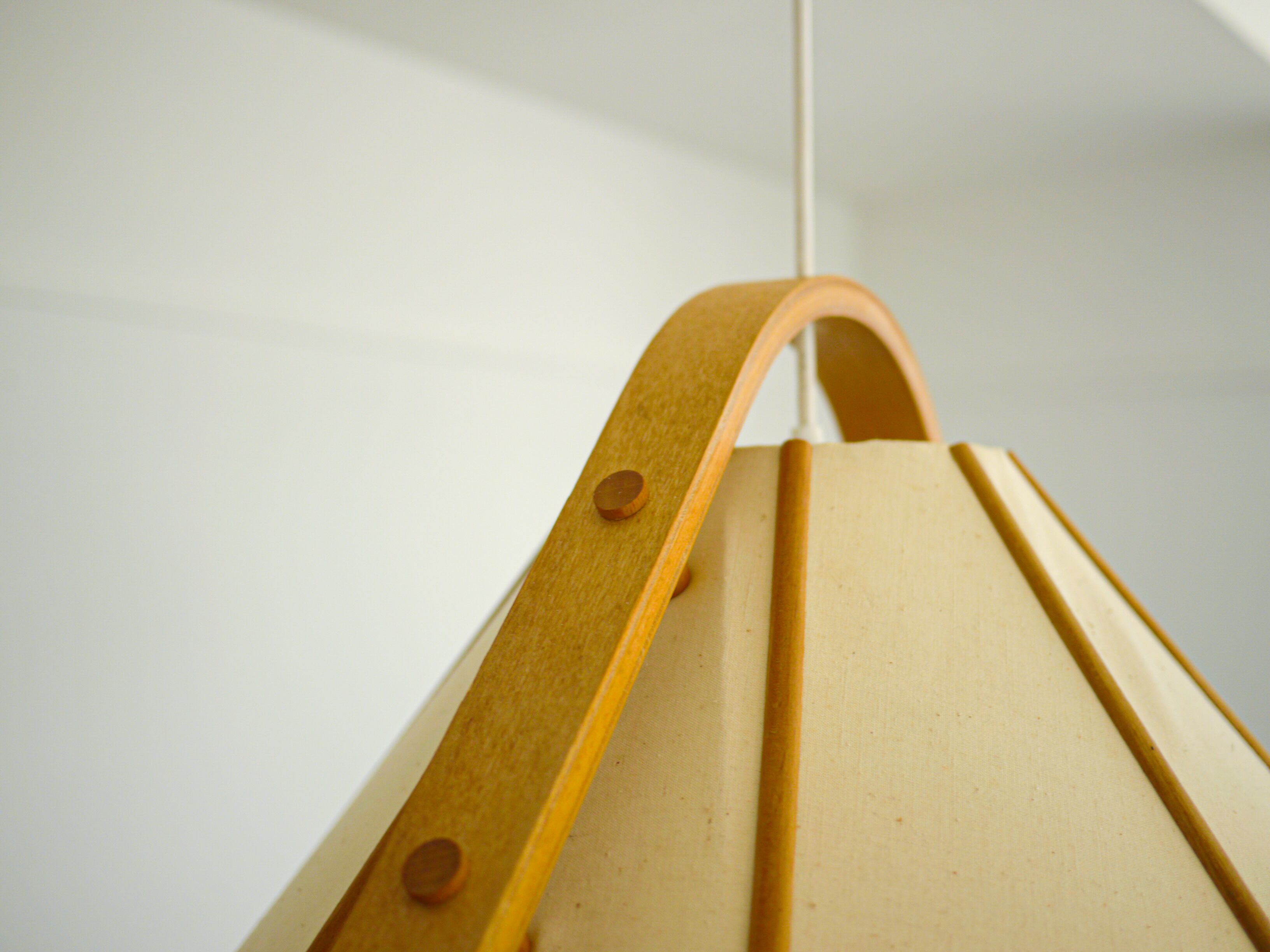 宙に浮くような曲木の飾りとキャンバスのシェードのプリミティブな素材感が楽しいペンダントランプ。キャンバスの内部はアクリルシェードになっている為、優しい光りがランプ内に溜まるように灯ります。テーブルトップはしっかり照らしながら、ぼんやりと周りの空間も照らしてくれます。