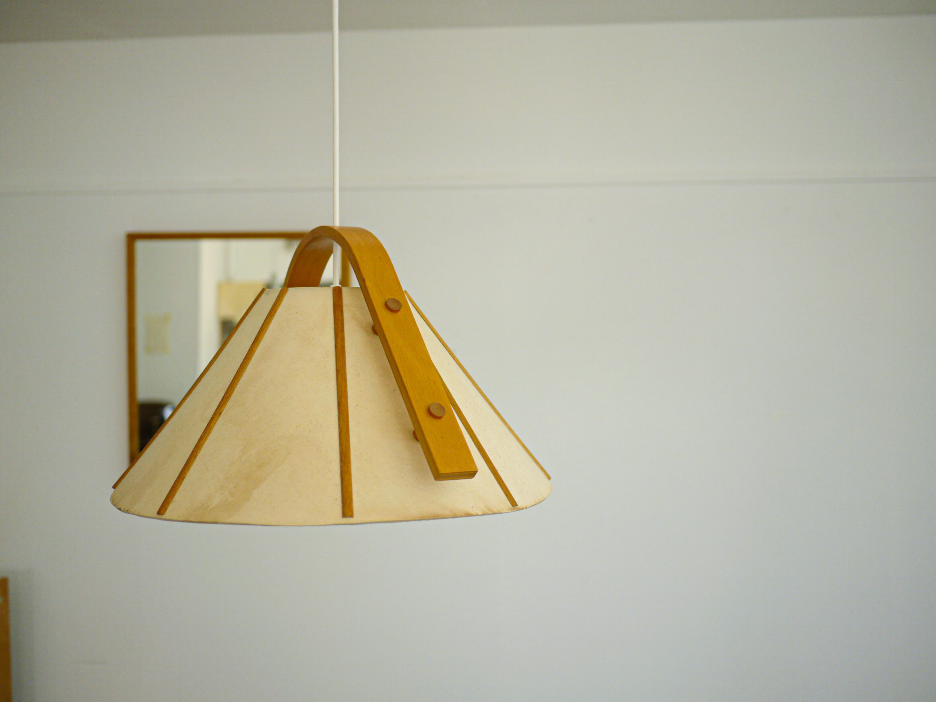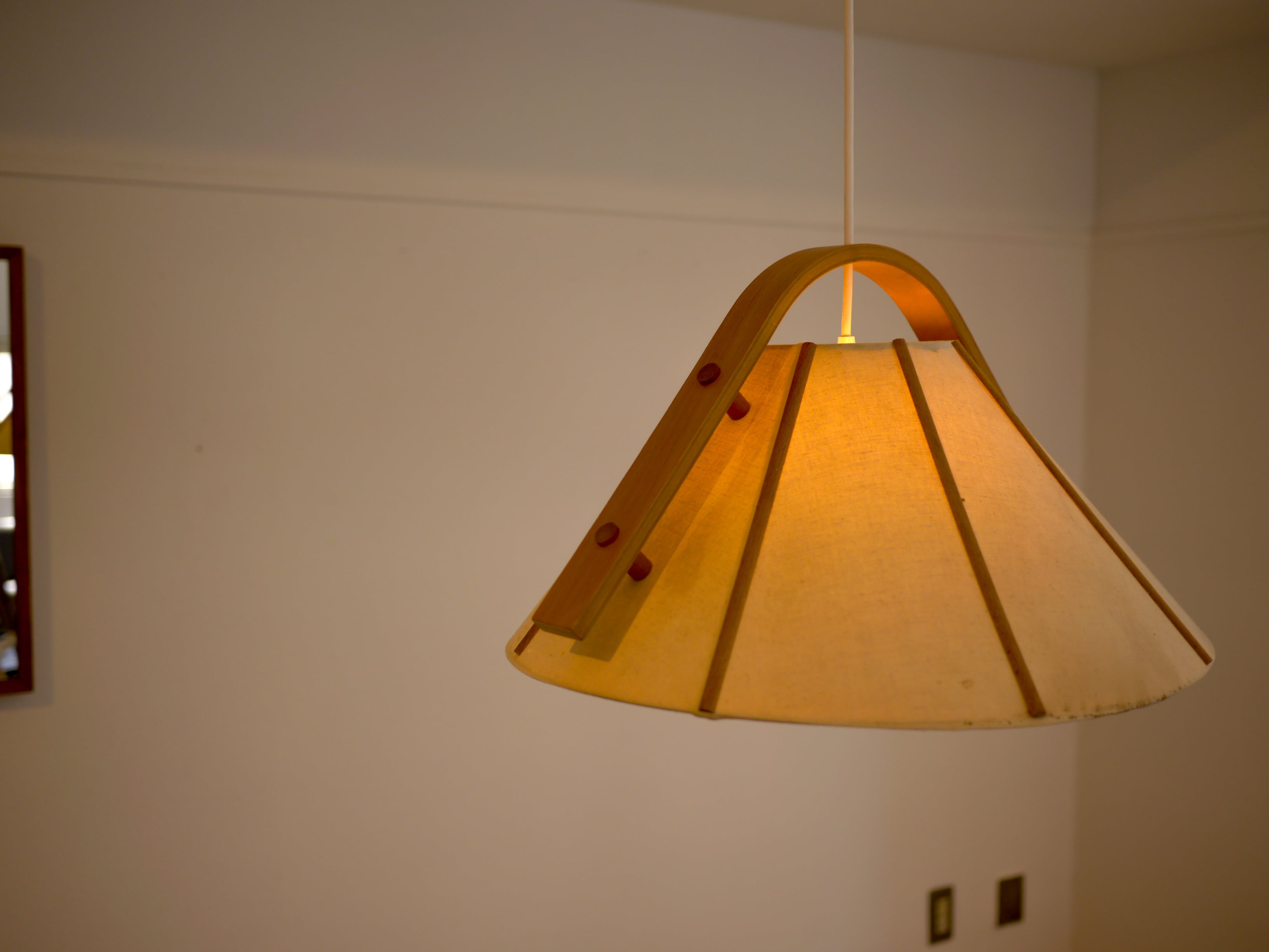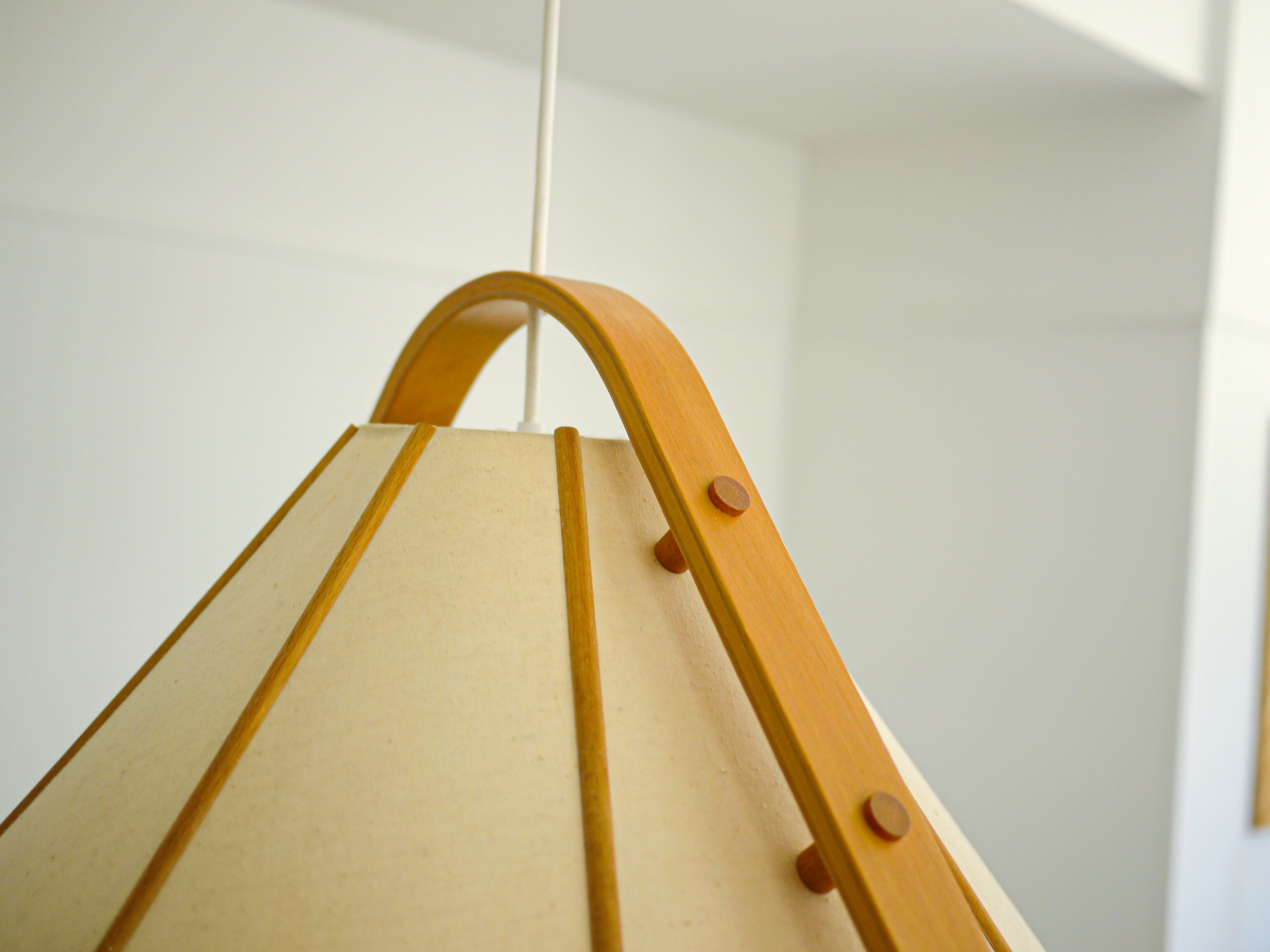 宙に浮くような曲木の飾りとキャンバスのシェードのプリミティブな素材感が楽しいペンダントランプ。キャンバスの内部はアクリルシェードになっている為、優しい光りがランプ内に溜まるように灯ります。テーブルトップはしっかり照らしながら、ぼんやりと周りの空間も照らしてくれます。