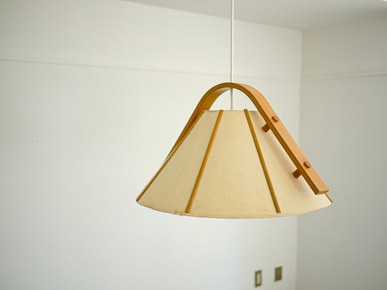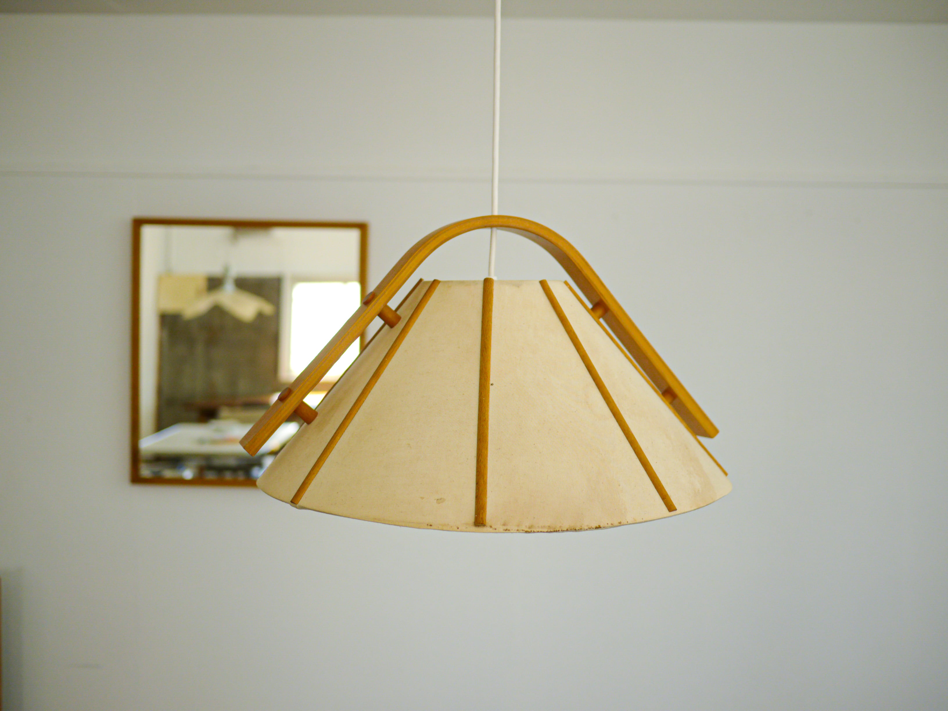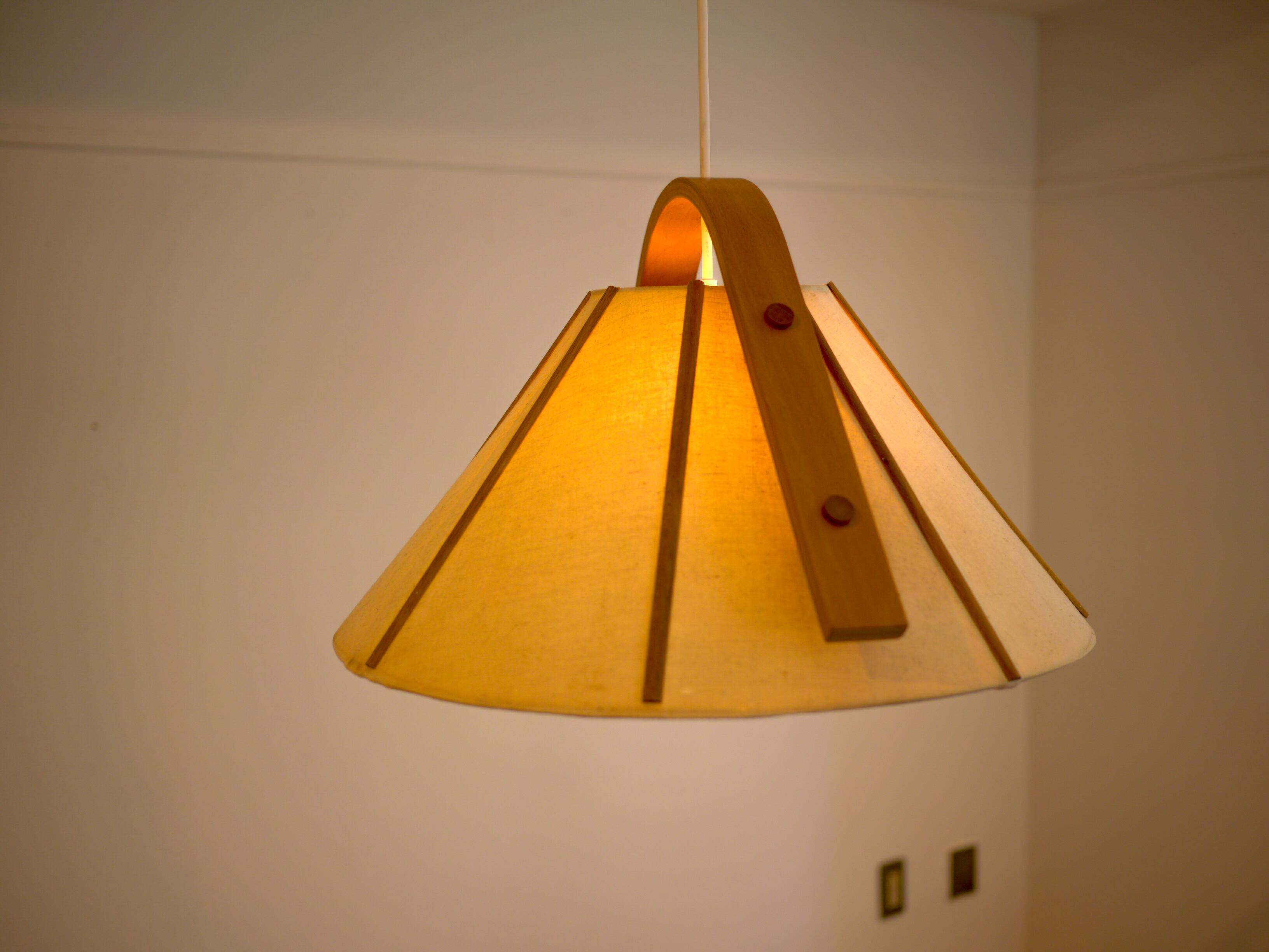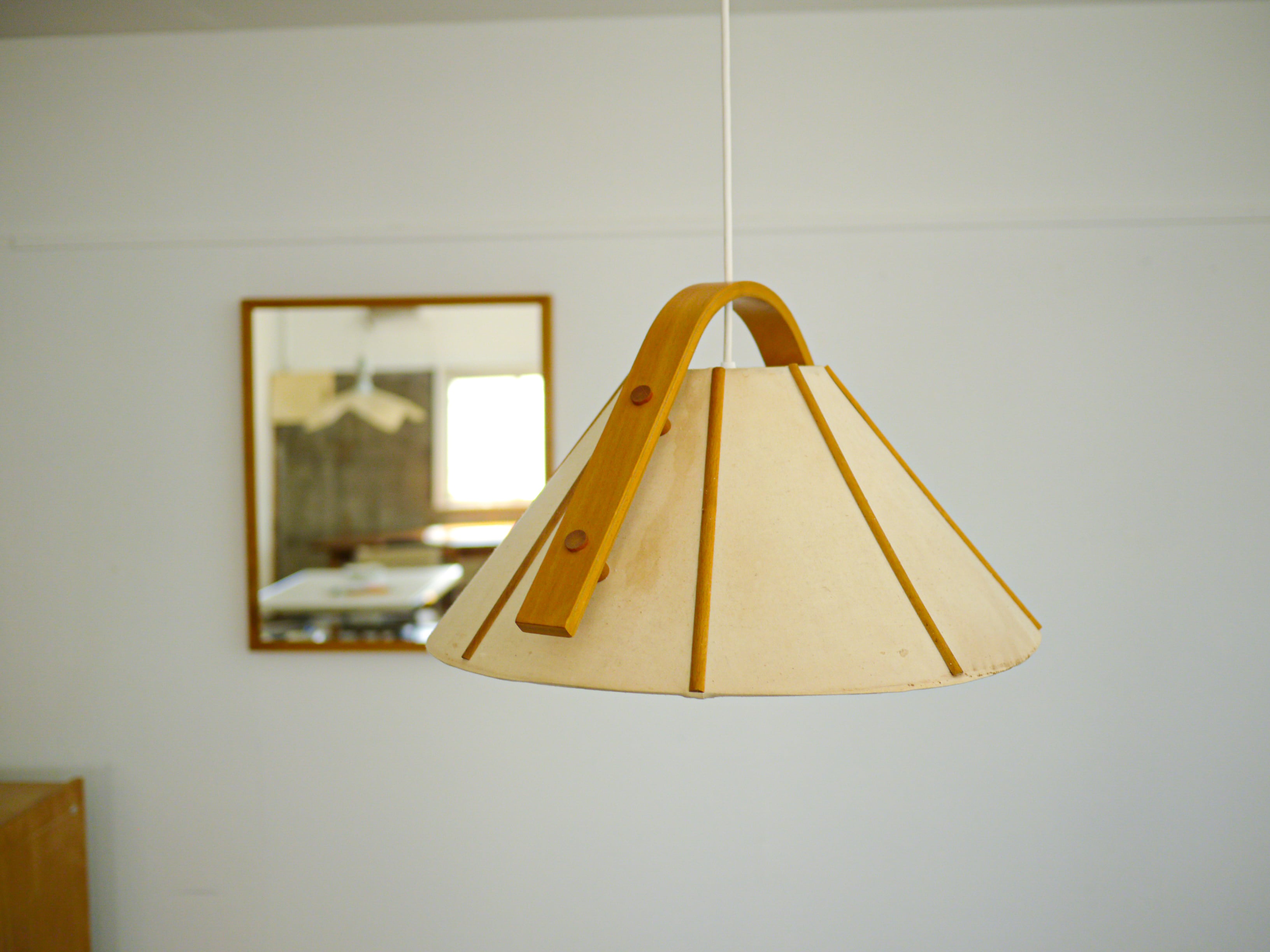 宙に浮くような曲木の飾りとキャンバスのシェードのプリミティブな素材感が楽しいペンダントランプ。キャンバスの内部はアクリルシェードになっている為、優しい光りがランプ内に溜まるように灯ります。テーブルトップはしっかり照らしながら、ぼんやりと周りの空間も照らしてくれます。
