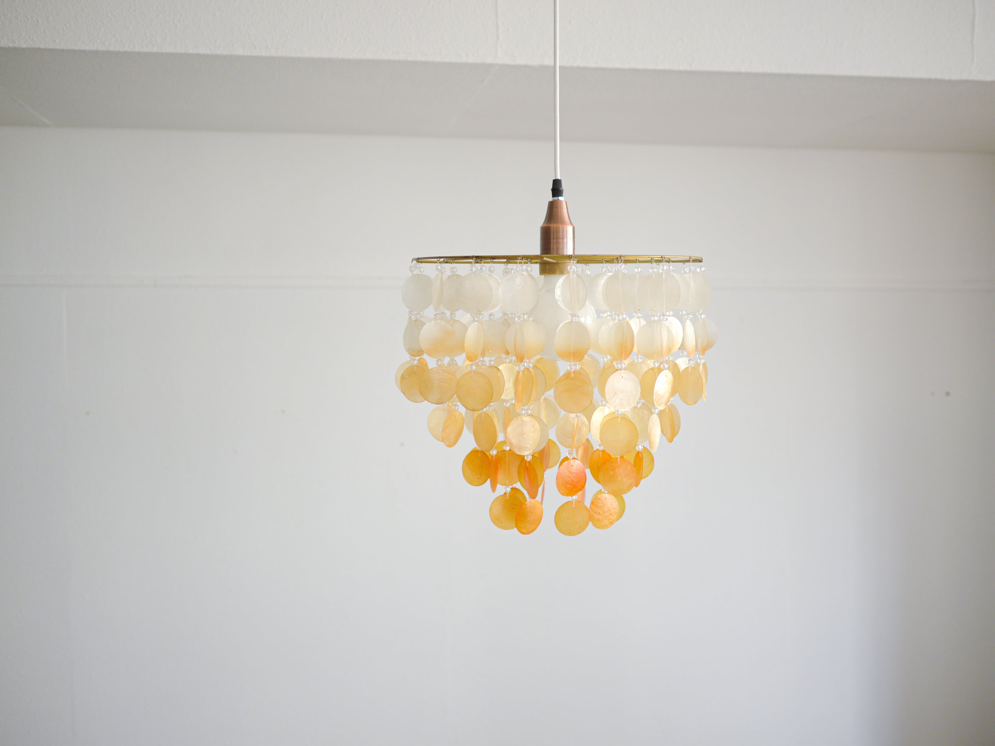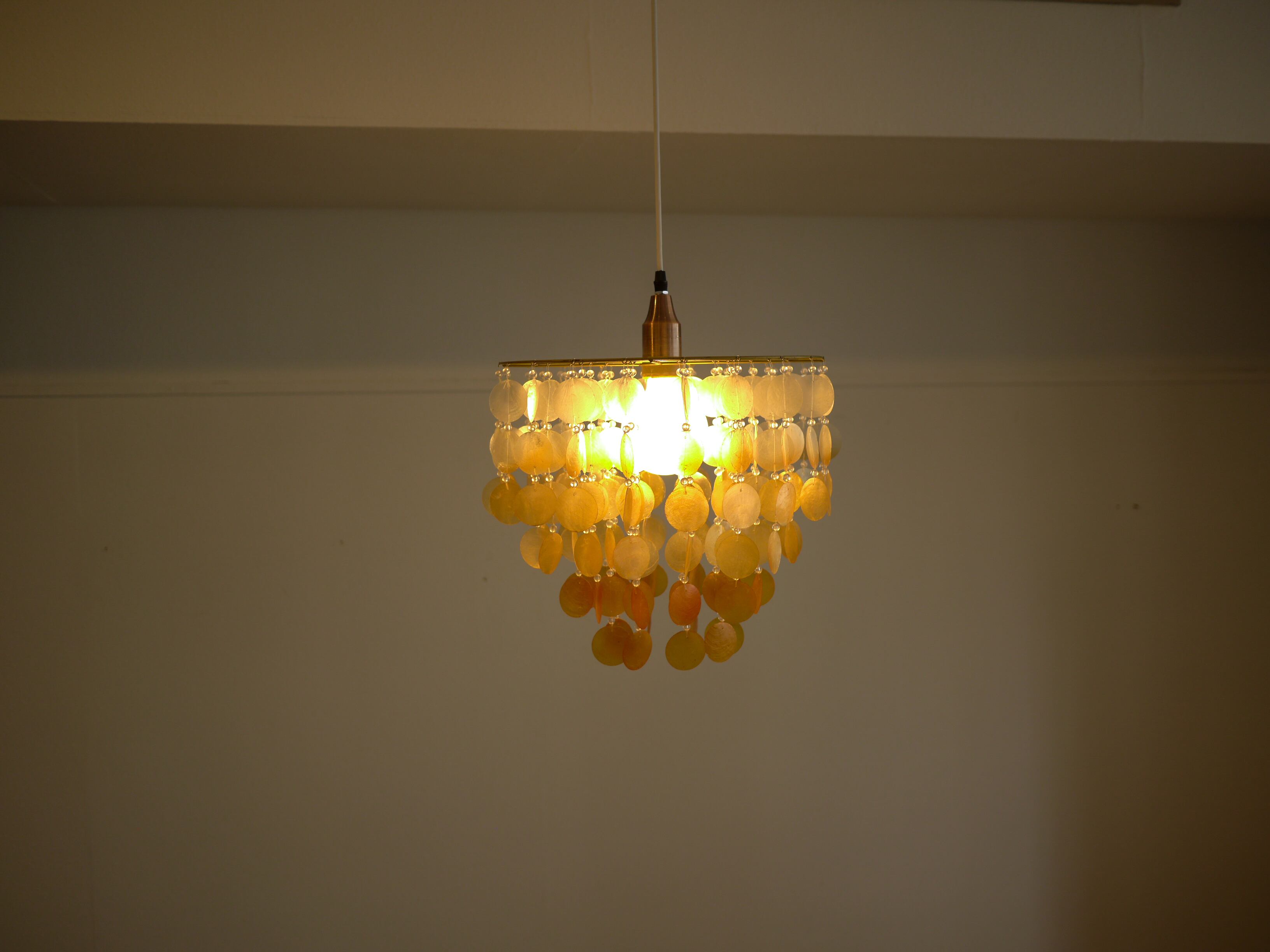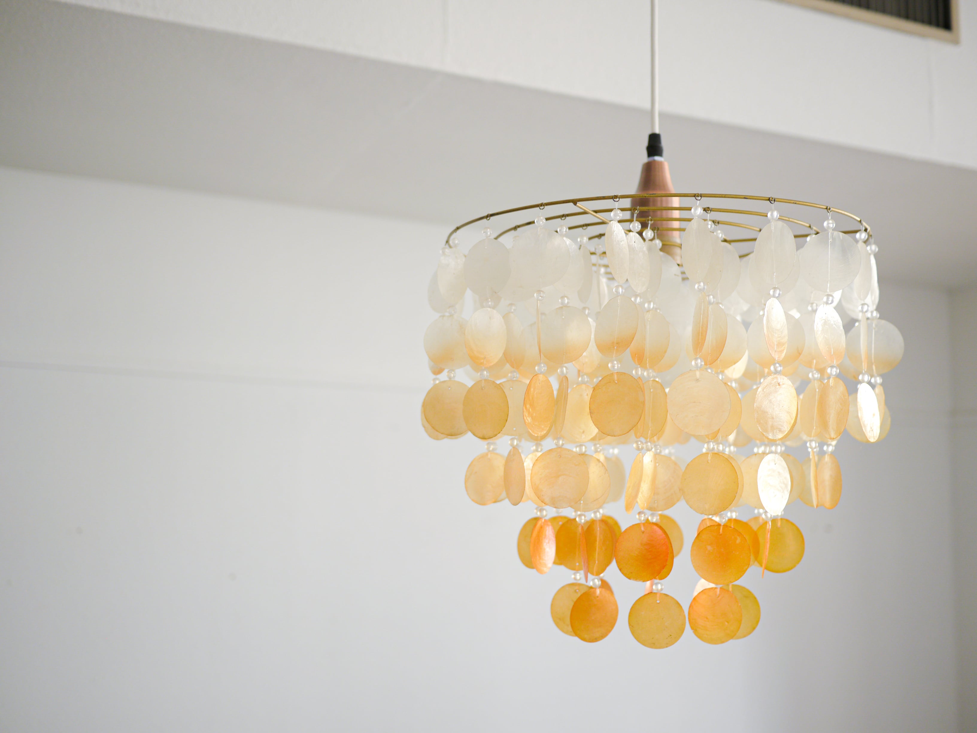 デンマーク人デザイナー、ヴェルナー・パントンのファンシェルシリーズに似ていますが、スタこちらのペンダントランプはおそらく樹脂製のシェルを使用してるパントンスタイルなペンダントランプ。カラーリングが面白く、光を灯すと表情の変化も楽しいランプです。また、風に揺れると風鈴の様な涼しげな音も聞こえます。